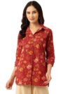 - Kurti has a round neck, three-quarter sleeves, straight hem, and side slits