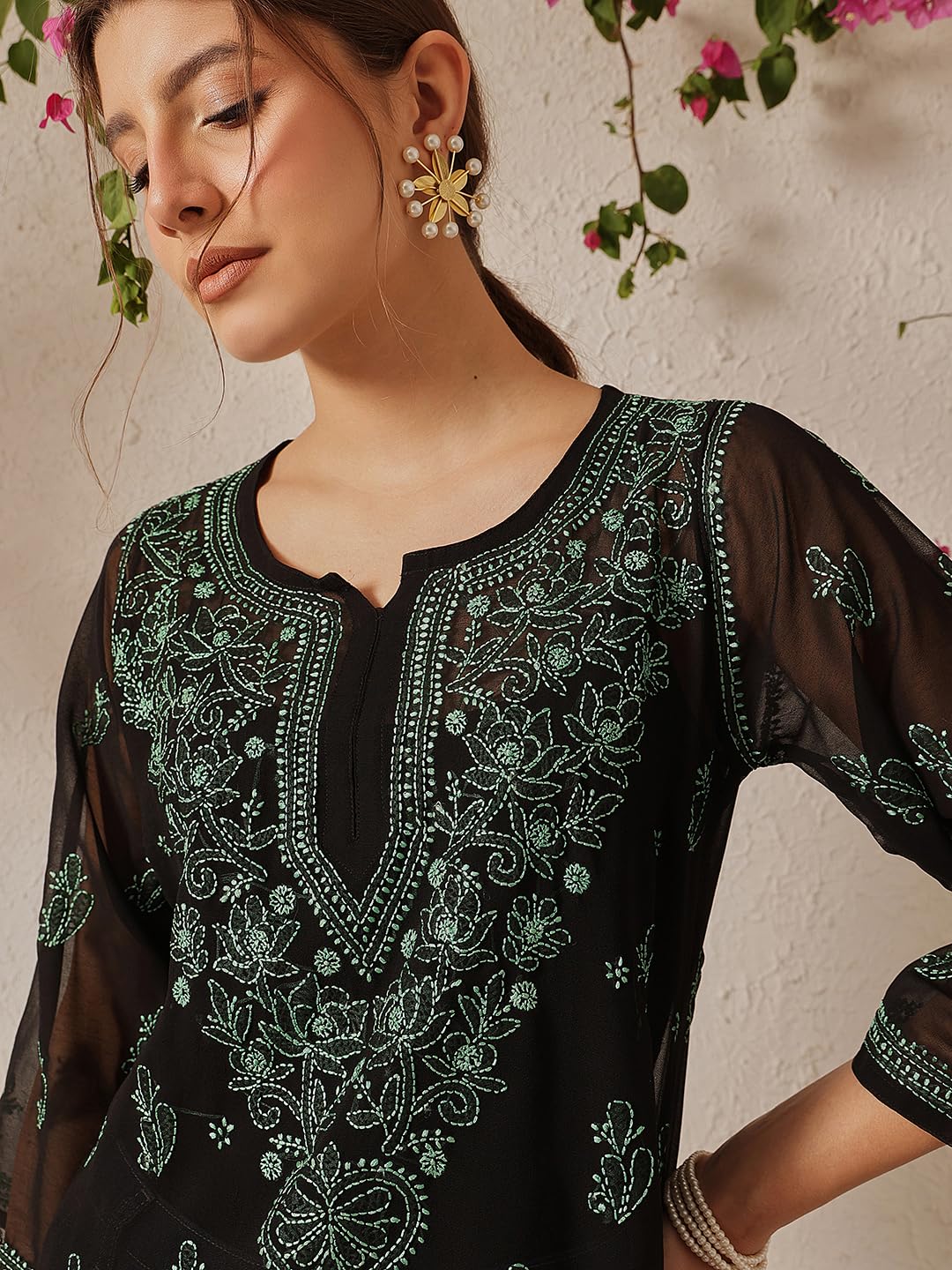 Ada Women Georgette Regular Black Short Top Kurti with Slip Traditional Handmade Chikan Tunic Dress A911133 (XL)