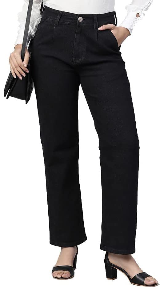 - Pleated Straight Jeans: ADBUCKS Loose fit Women’s jeans designed for comfort and style without compromising on versatility. These jeans are pleated at belt to provide extra comfort in daily wear. Crafted from a high-quality blend of cotton and a touch of elastane (lycra), these jeans provide the perfect balance of durability and stretch for all-day wear