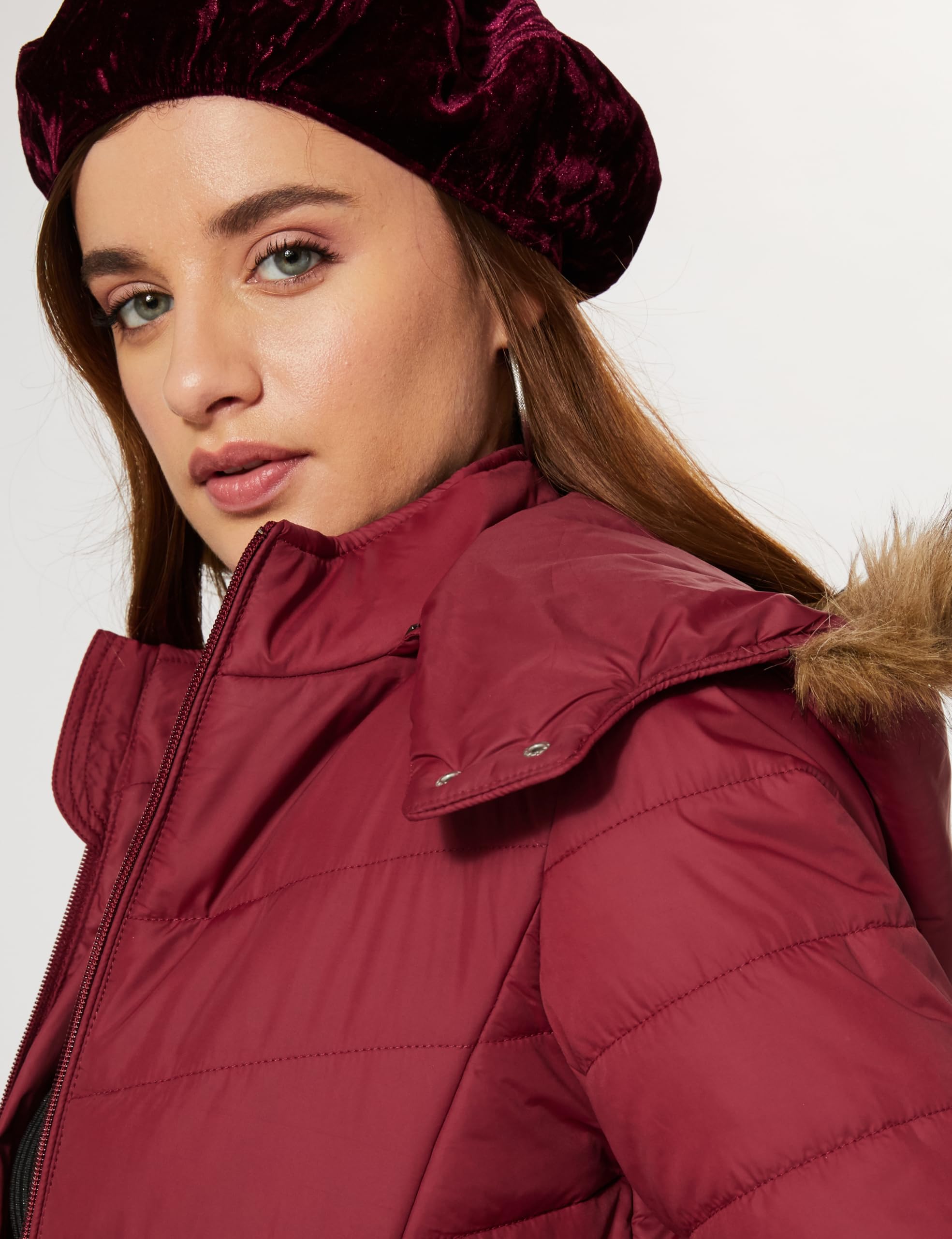 - This jacket features a collar with faux fur detail, front zipper closure and functional pockets