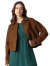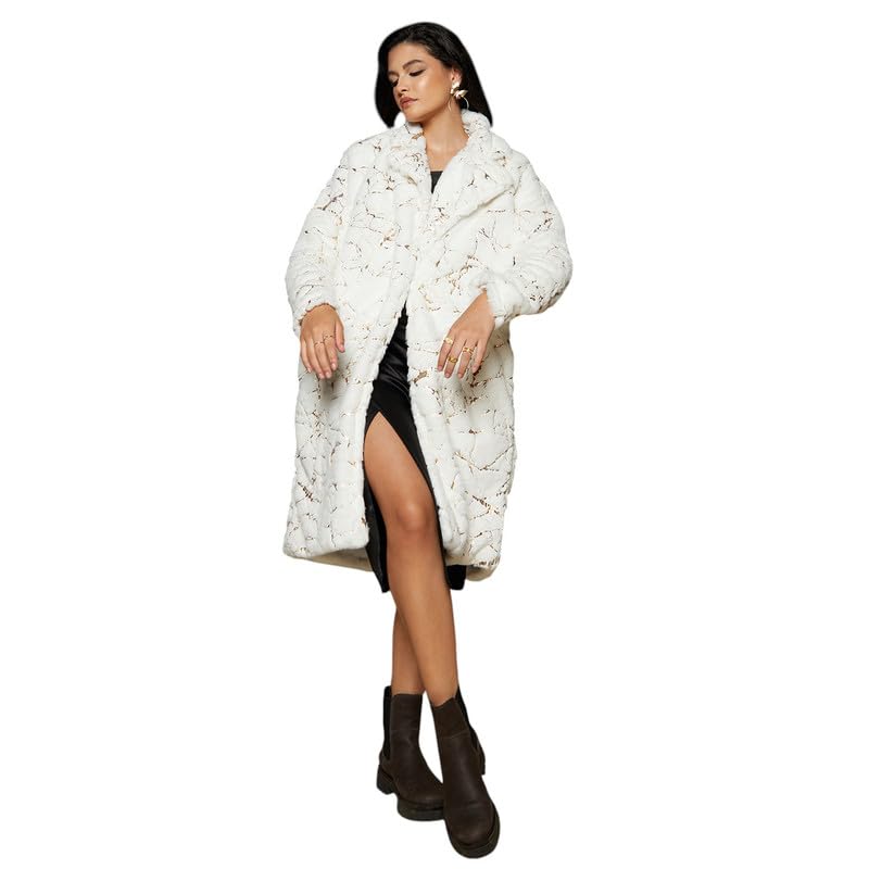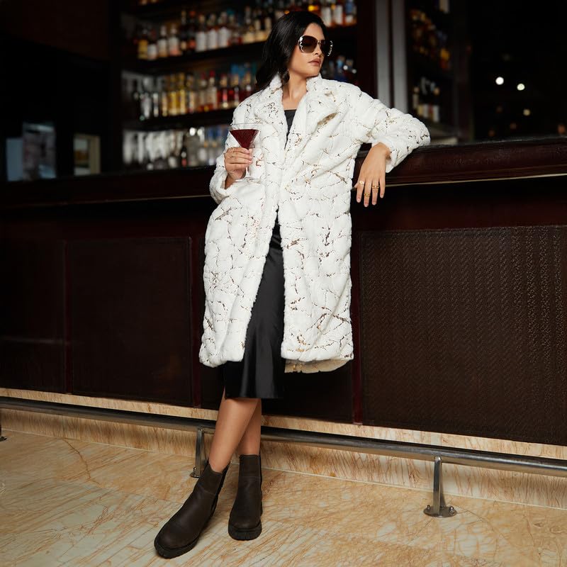 Campus Sutra Women’s Chalk White Metallic-Veined Fur Long Coat For Casual Wear | Lapel Collar | Long Sleeve | Button Closure | Coat Crafted With Comfort Fit For Everyday Wear