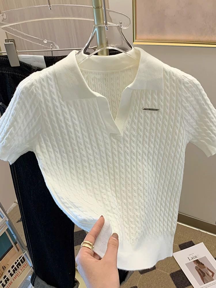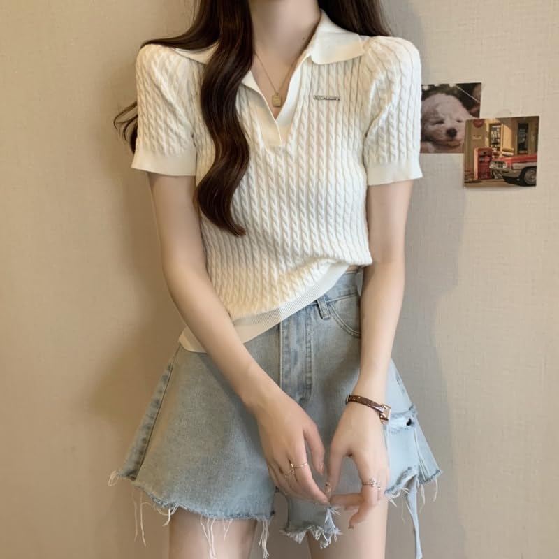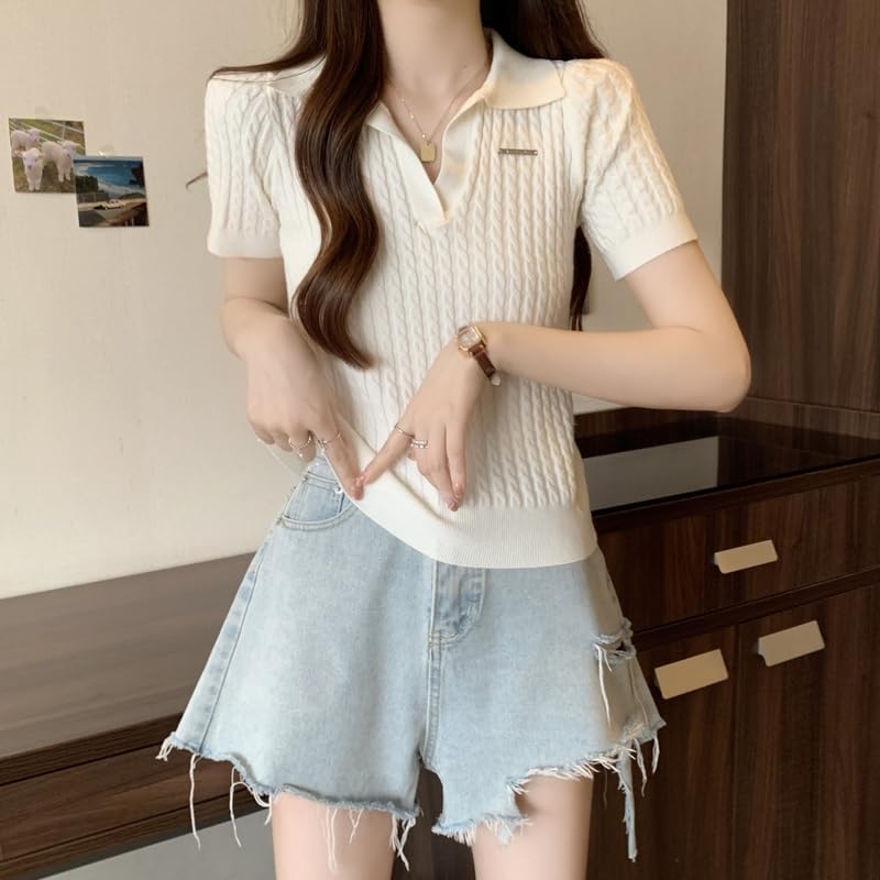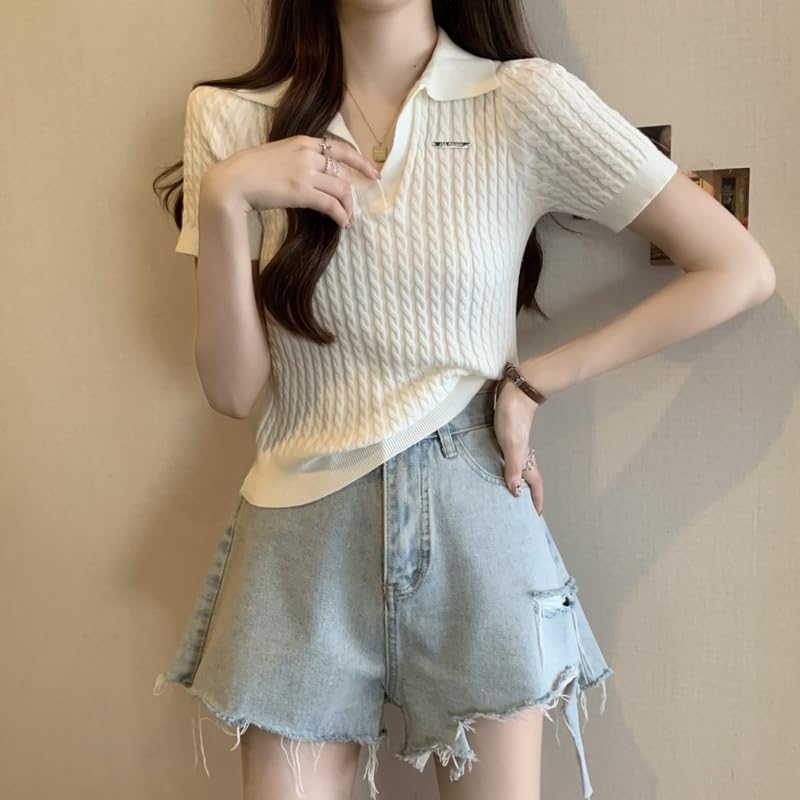 ICW Women’s Knitted Ribbed Self-Design Short Sleeve Polo Neck Collar Crop Top T-Shirt DN1200 (in, Alpha, XS, Regular, White)