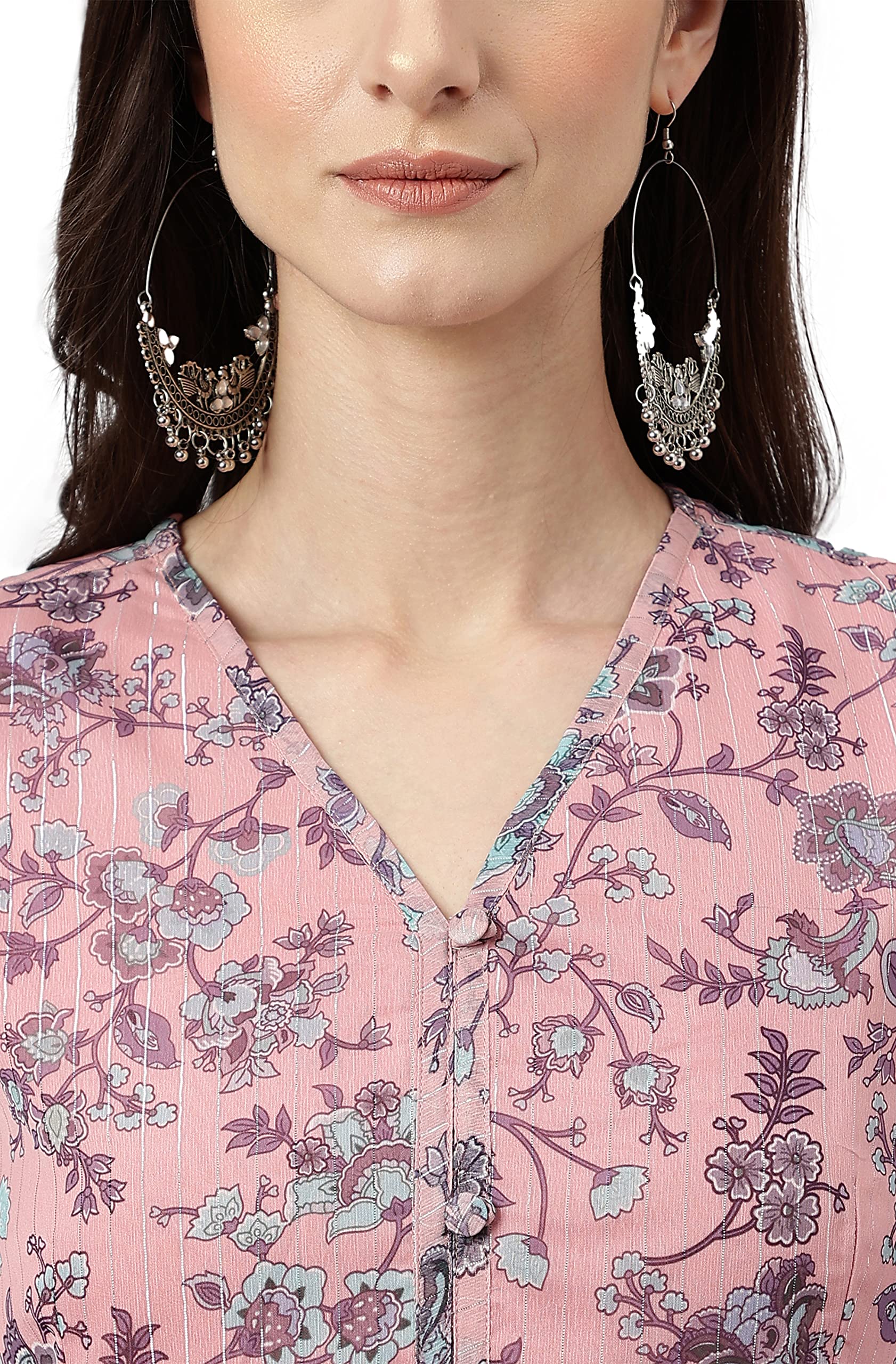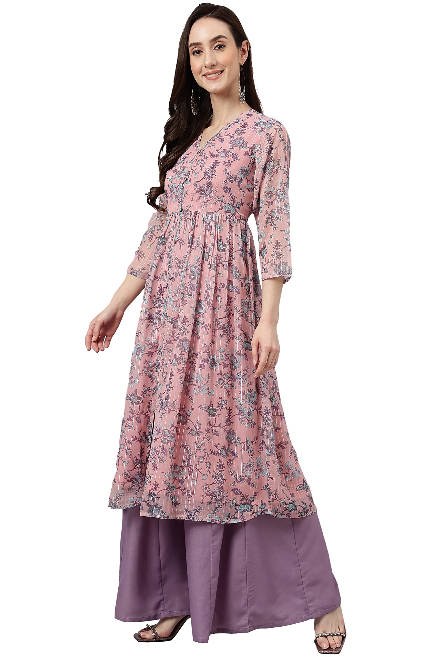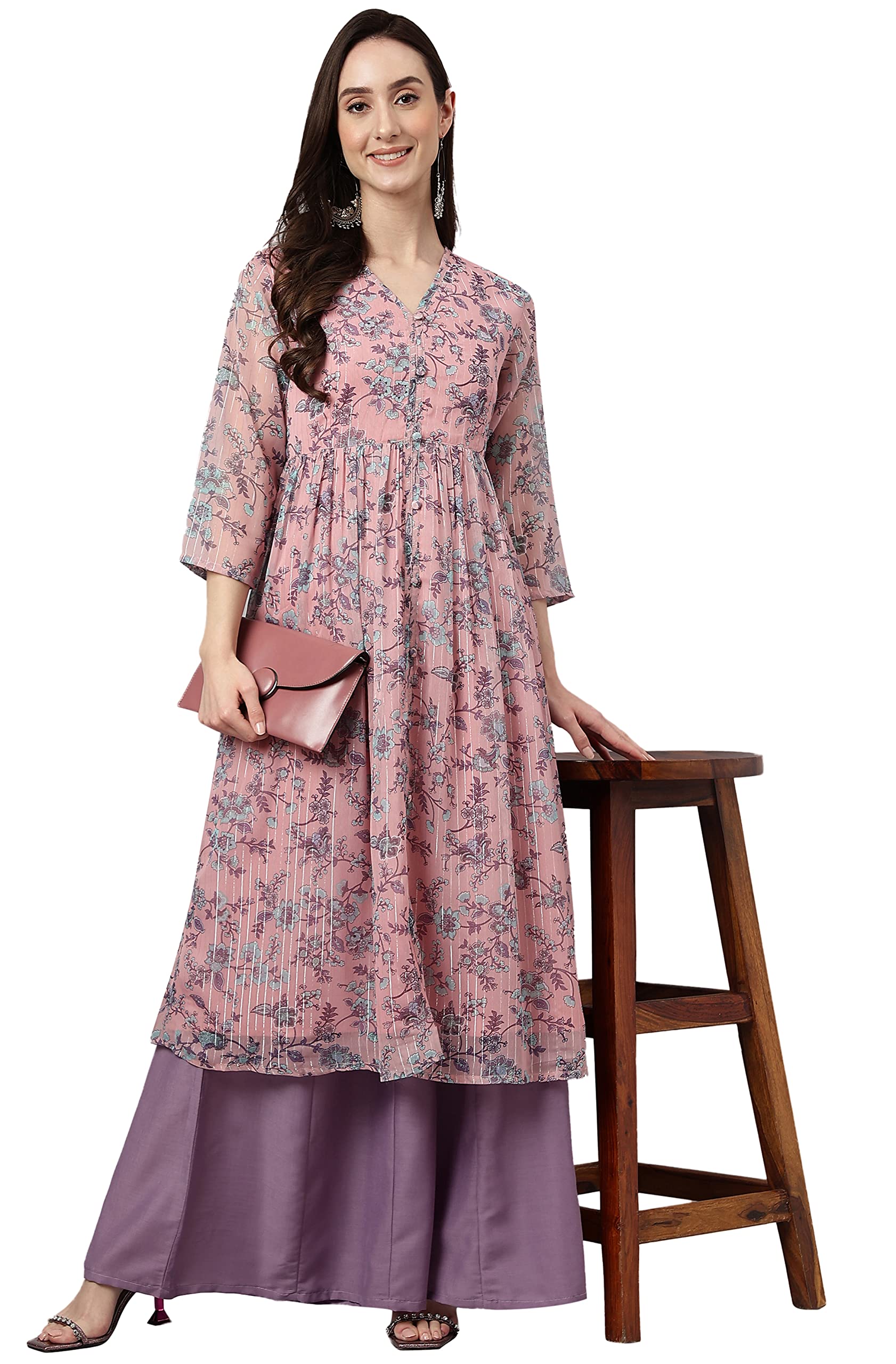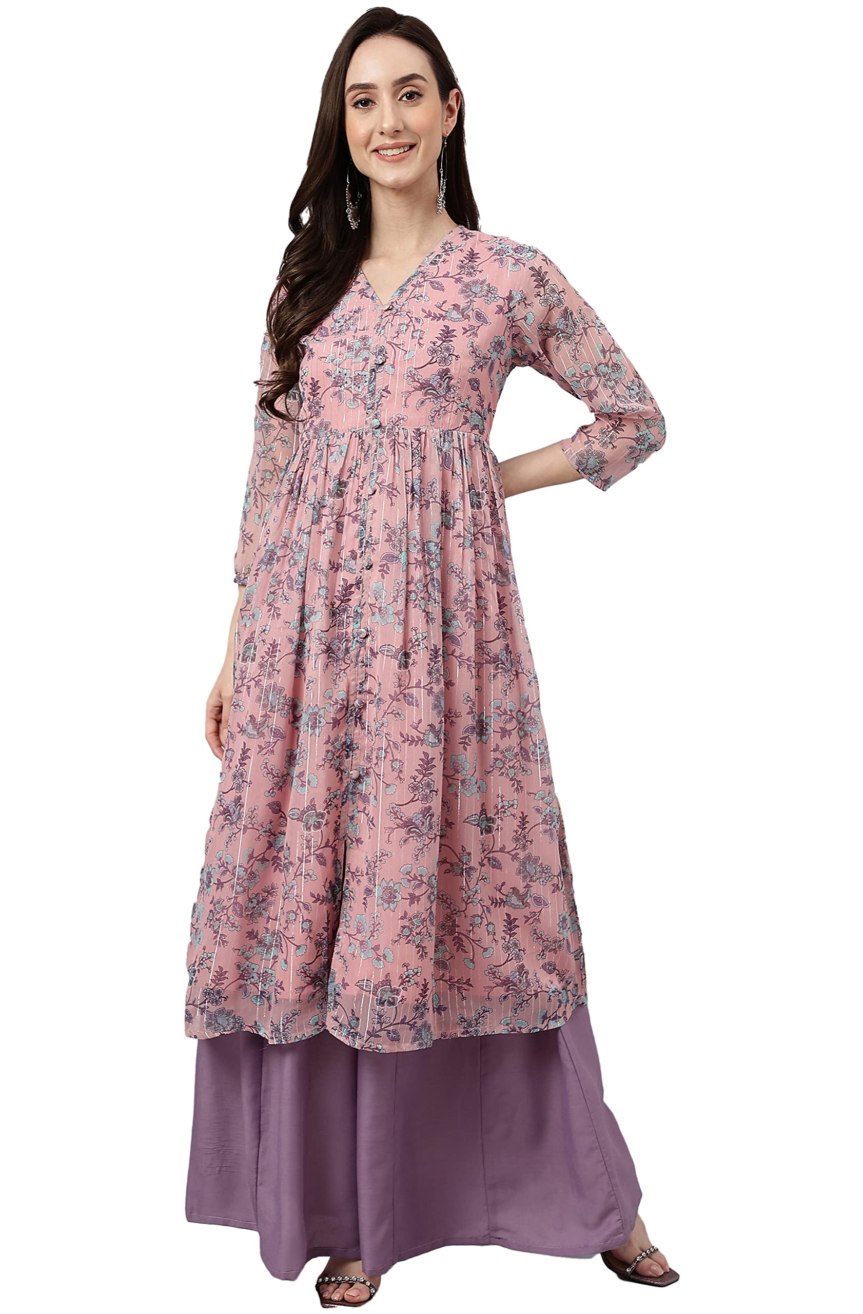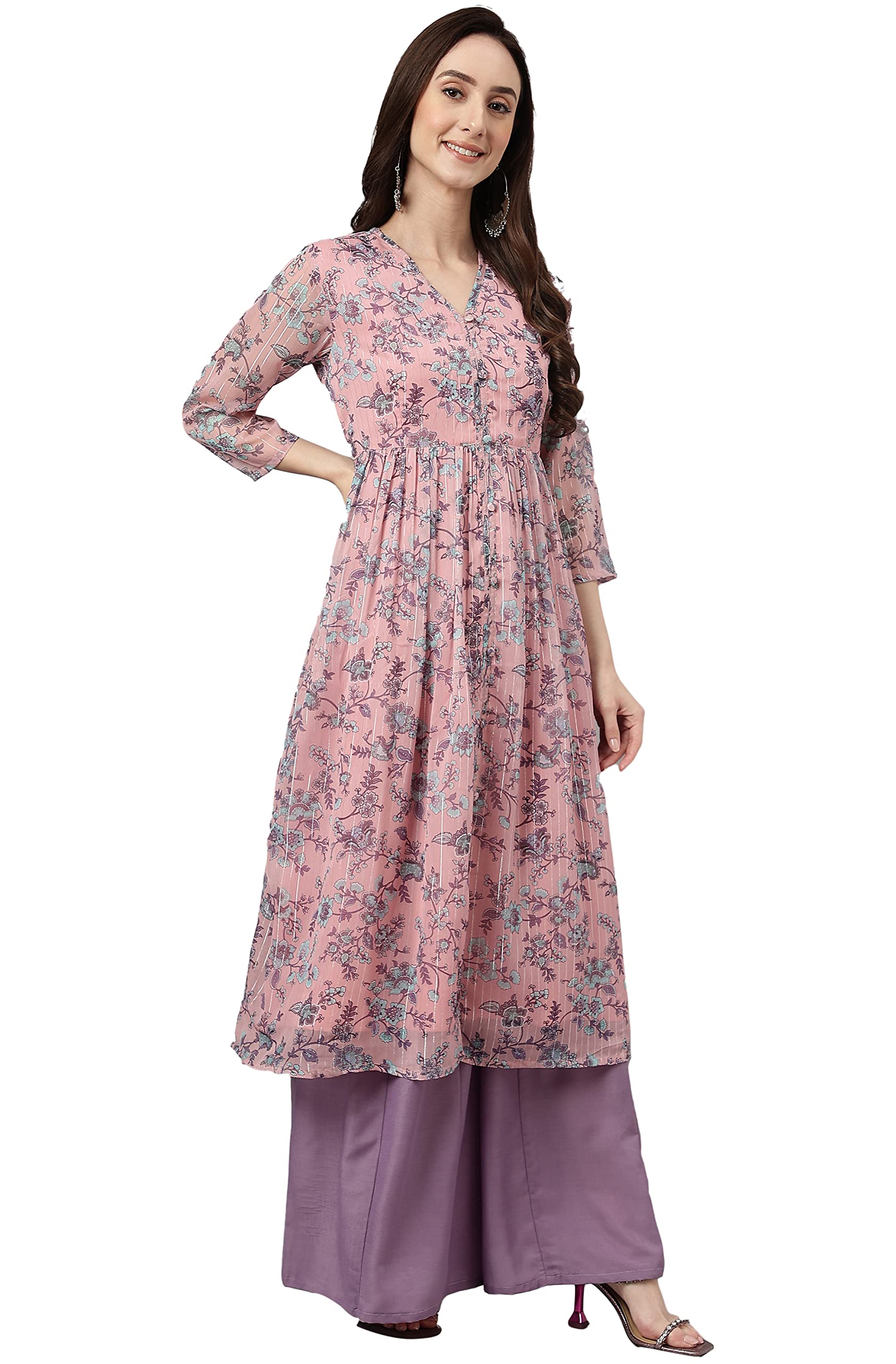 Bring your style game to elegance with this pink chiffon lurex floral printed flared kurta by Janasya featuring all over floral prints, v neck with gathers on the front panel, 3/4th sleeves with fit and flared silhouettes. Pair it up with solid pants to complete the look. The kurta includes butter crepe lining.