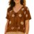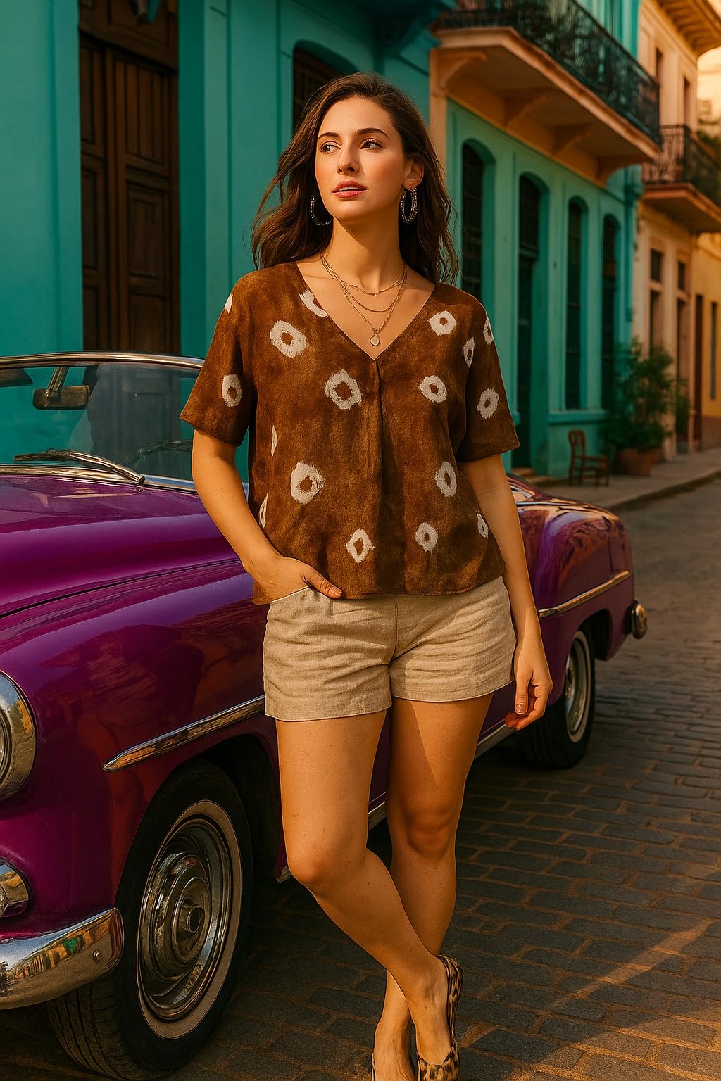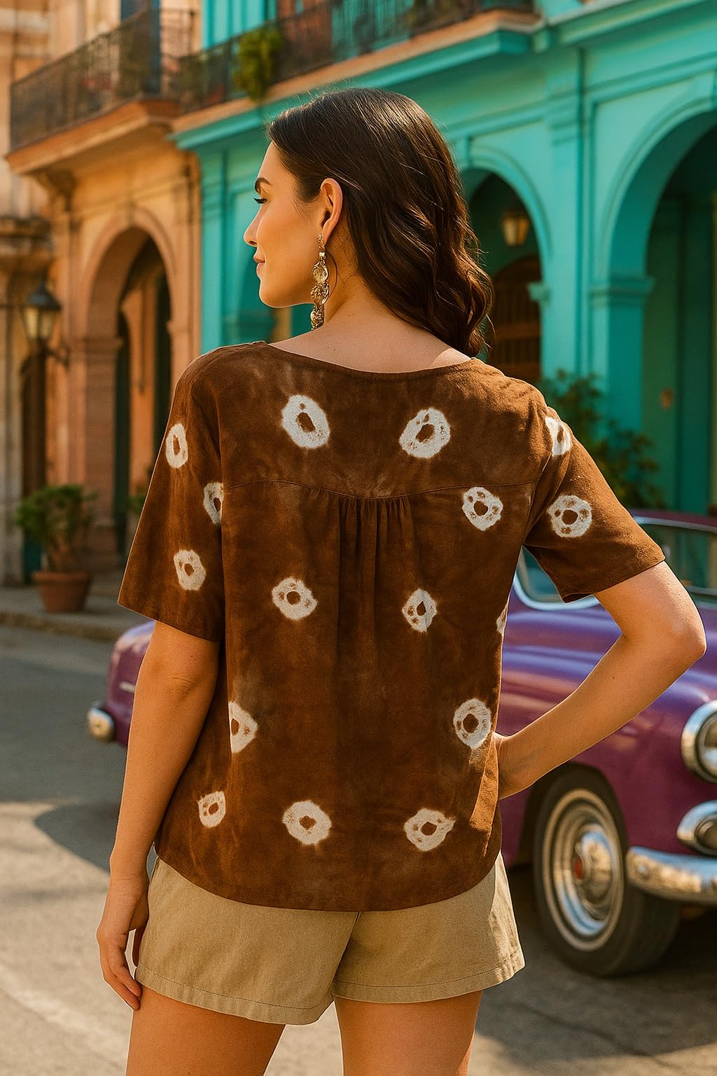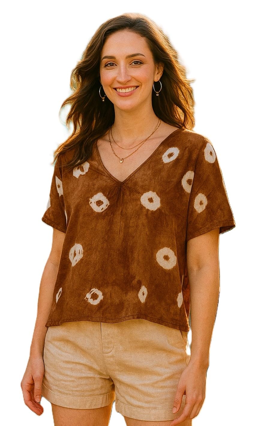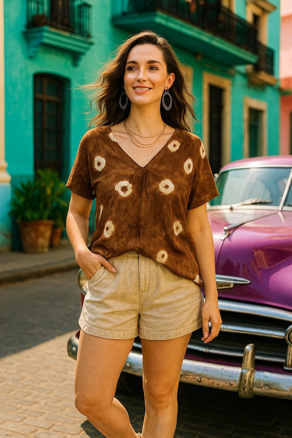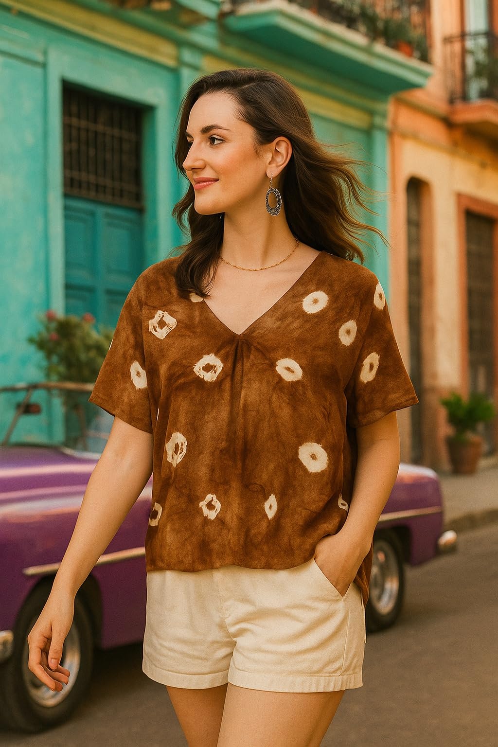 Maaesa Women Brown Handcrafted Tie-Dye Rayon Loose Fit Top | V-Neck | Short Sleeves | Lightweight & Breathable Fabric | Casual Wear | Office Wear
