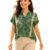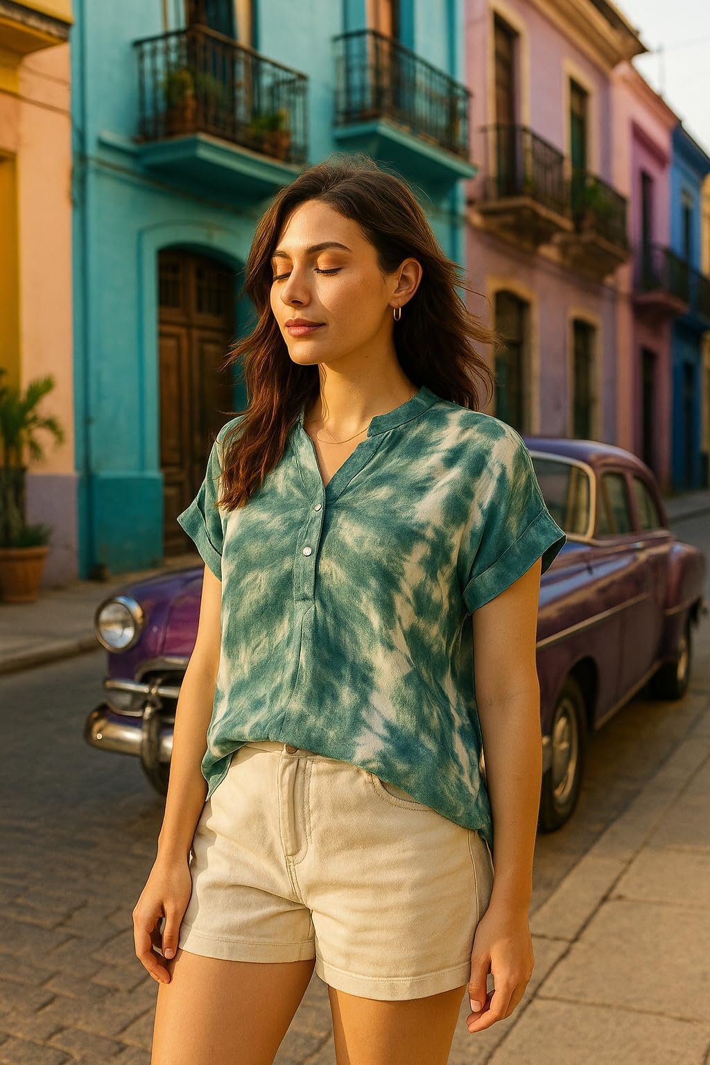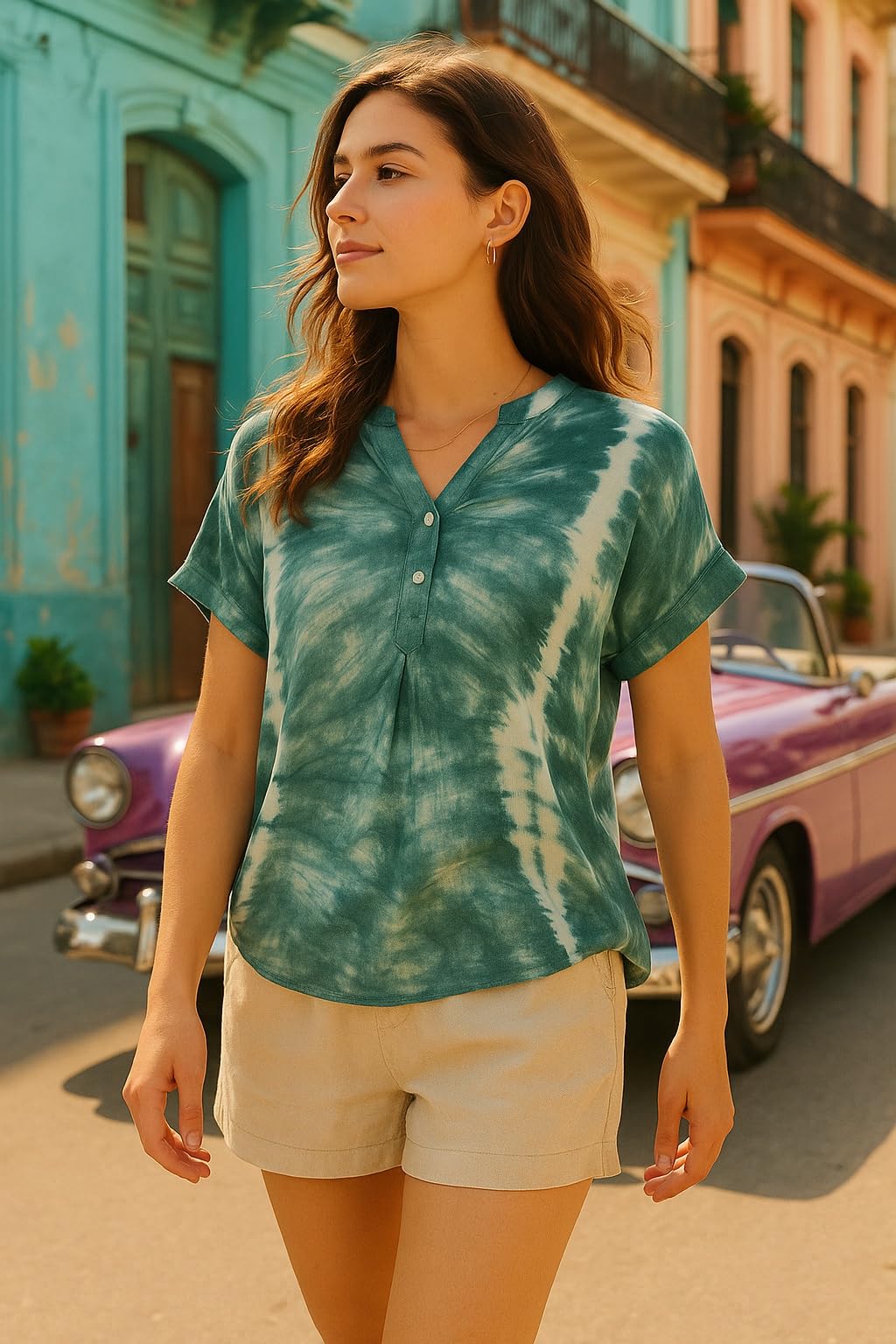 Maaesa Women Green Handcrafted Tie-Dye Rayon Loose Fit Top | Mandarin Collar | Short Sleeves | Lightweight & Breathable Fabric | Casual Wear & Office Wear