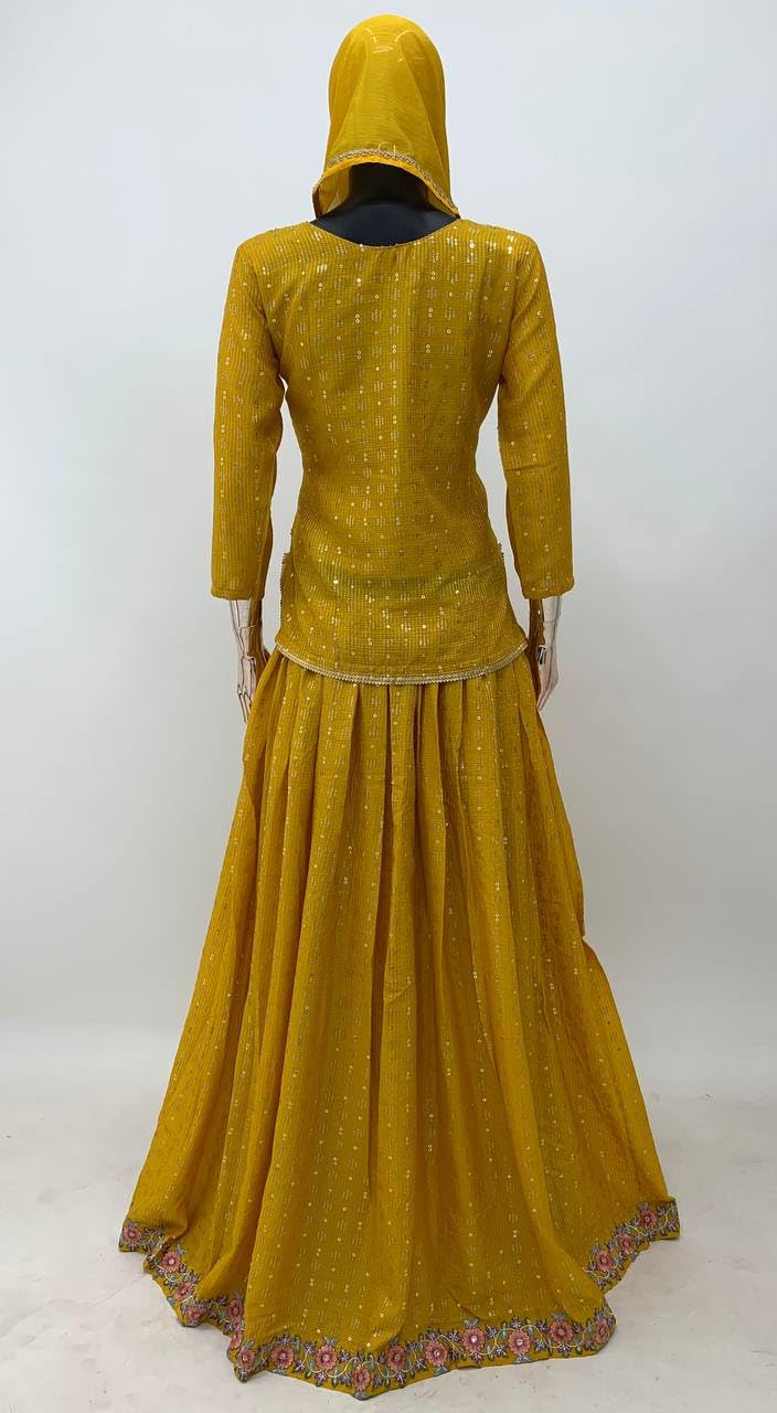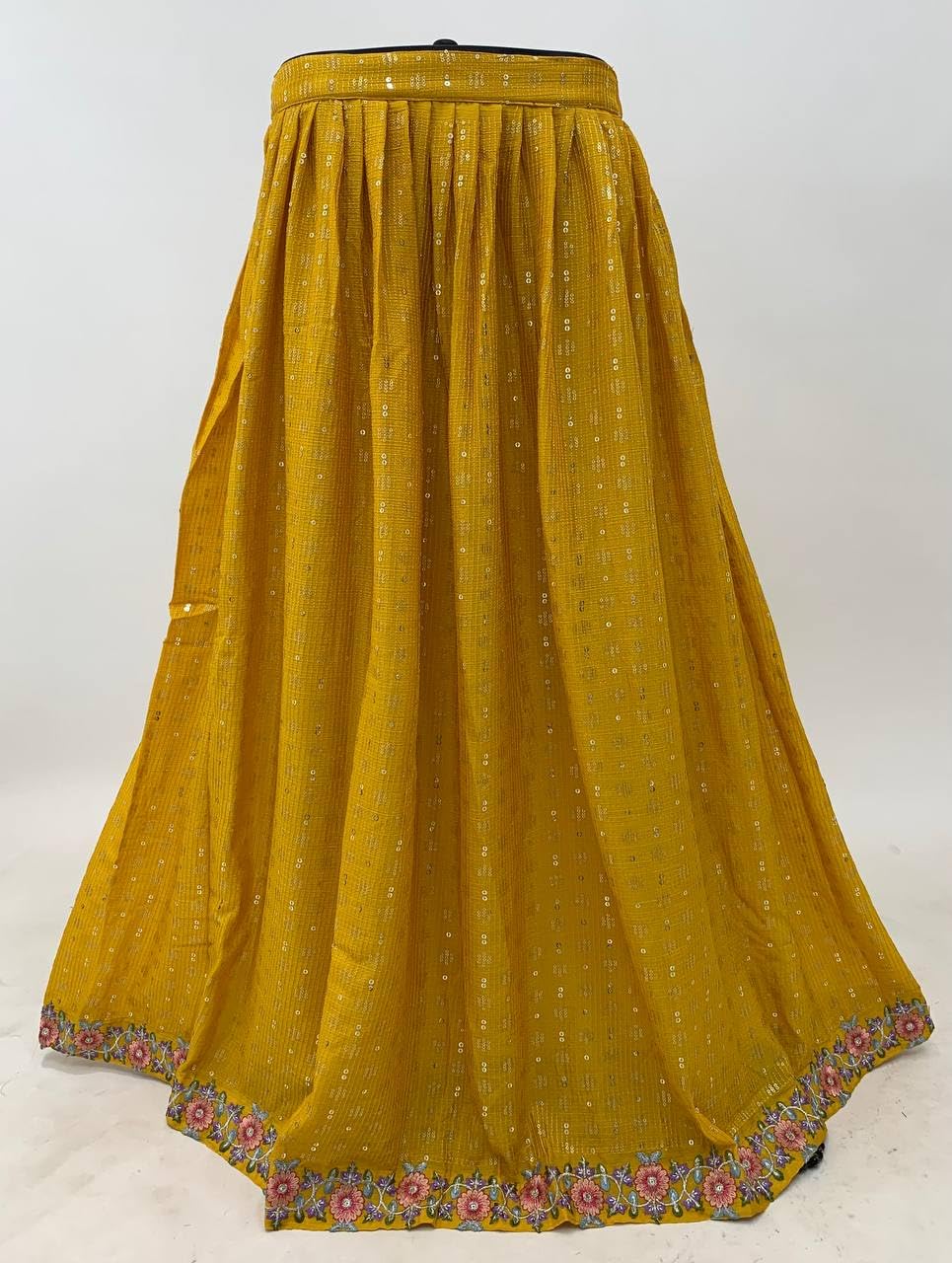 Top Details : Color : Yellow, Top Fabric : Chinon, Top Stitching : Stitched, Top Work : Embroidered, Top Length : 26 Inches , Top Type : Straight Choli, Product Type : Lehenga Choli Set Bottom Details : Bottom Fabric : Chinon, Bottom Inner : Santoon, Bottom Stitching Type : Stitched, Bottom Length : 44 Inch, Bottom Waist : 40 Inch Dupatta Details : Dupatta Fabric : Chinon, Dupatta Work : Embroidered, Dupatta Fabric Length : 2.15 Mtrs