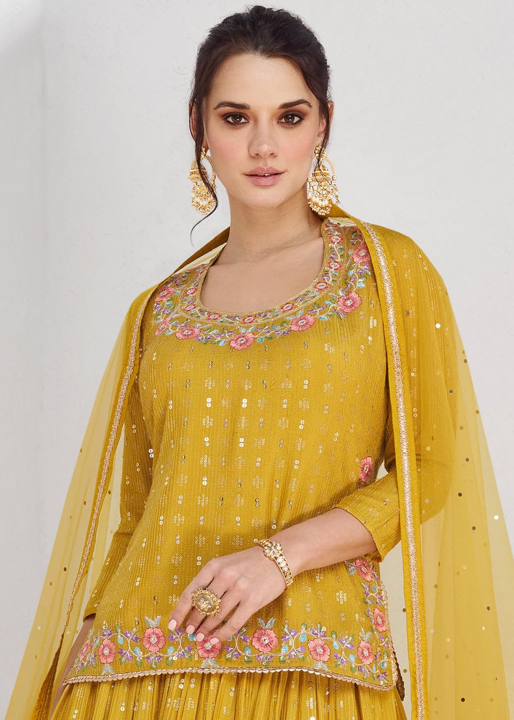 Miss Ethnik Women’s Yellow Chinon Stitched Top With Stitched Bottom and Dupatta Full Sleeve Embroidered Straight Choli (ME-1170-Yellow-XL)
