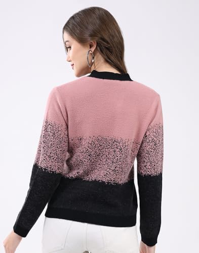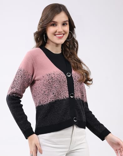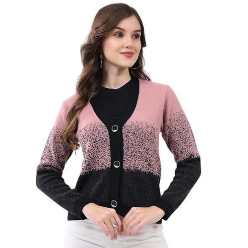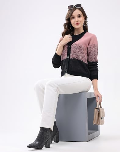 Monte Carlo Women V Neck Self Design Cardigan | Regular Fit Full Sleeve Knitwear | Elegant Winter Sweater for Office & Casual Outfits Black & Pink M (Pack of 1)