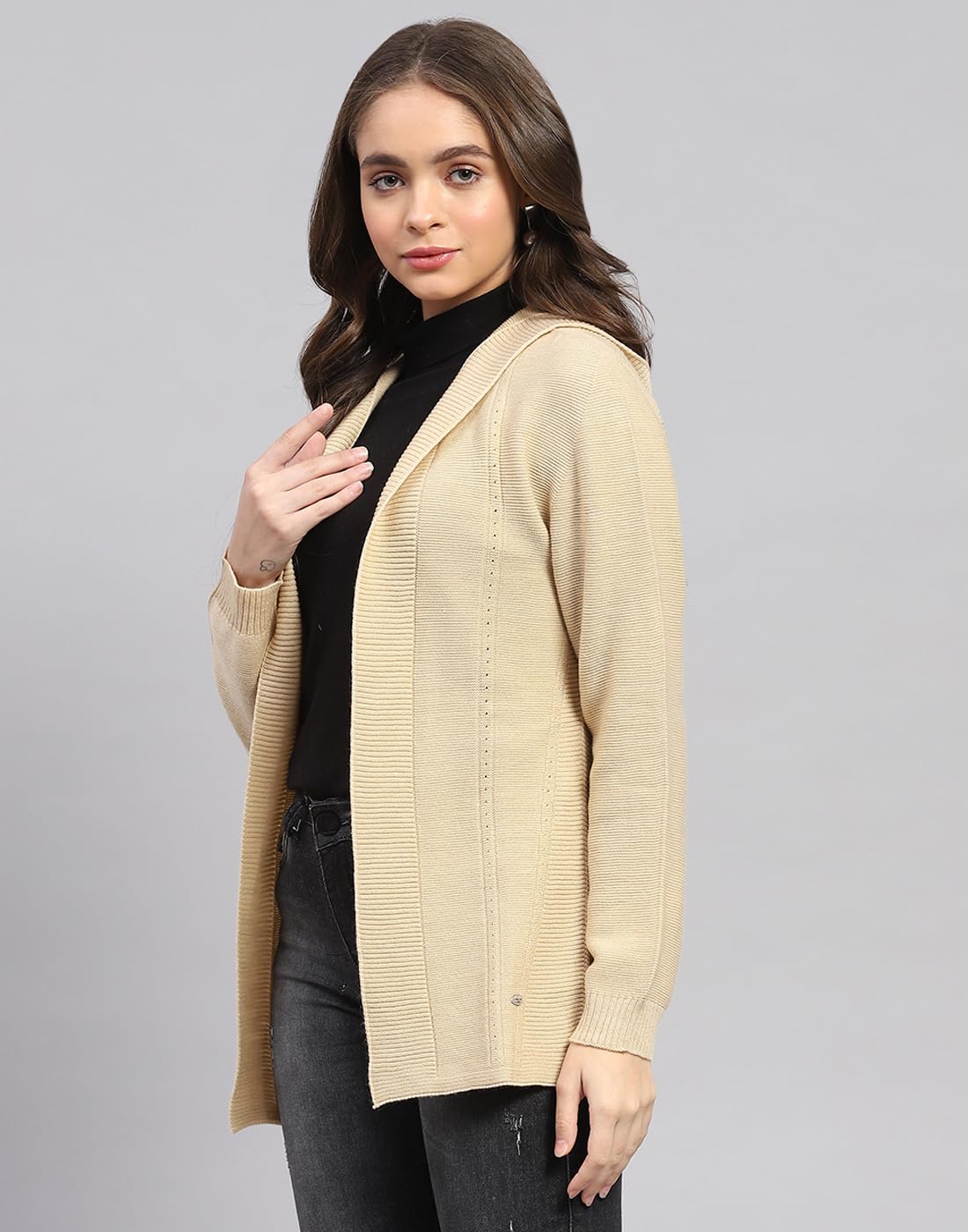 Monte Carlo Womens Self Design Front Open Wool Blend Cardigan Beige L