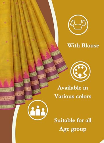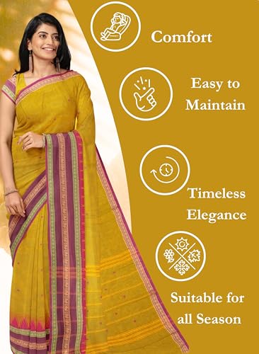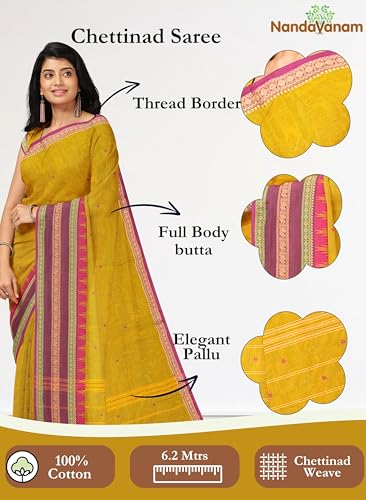 NandaVanam Women’s Chettinad Cotton Sarees with Long Border | Pure Cotton Saree with Blouse | Soft, Comfort Handloom Sarees | Cotton Sarees for Daily Use and All Occassion Wear (Mustard Green)