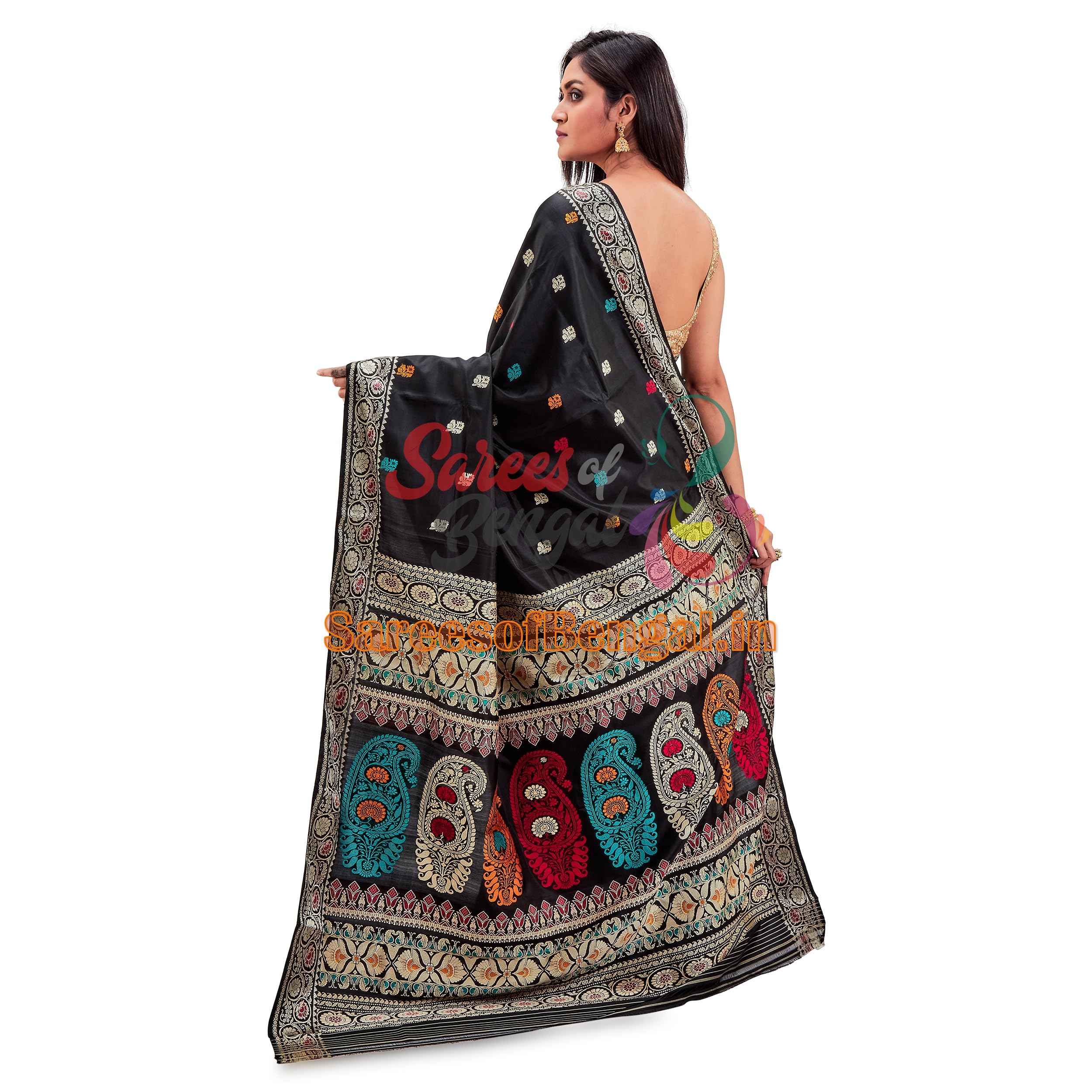 PRANTIKA Women’s Bishnupuri Katan Silk Meenakari Revival Original Baluchari Swarnachari Bengal Saree Black