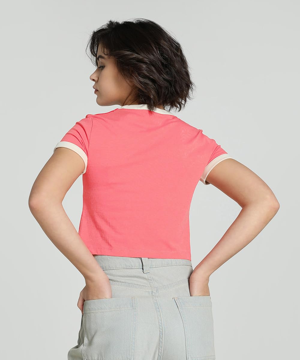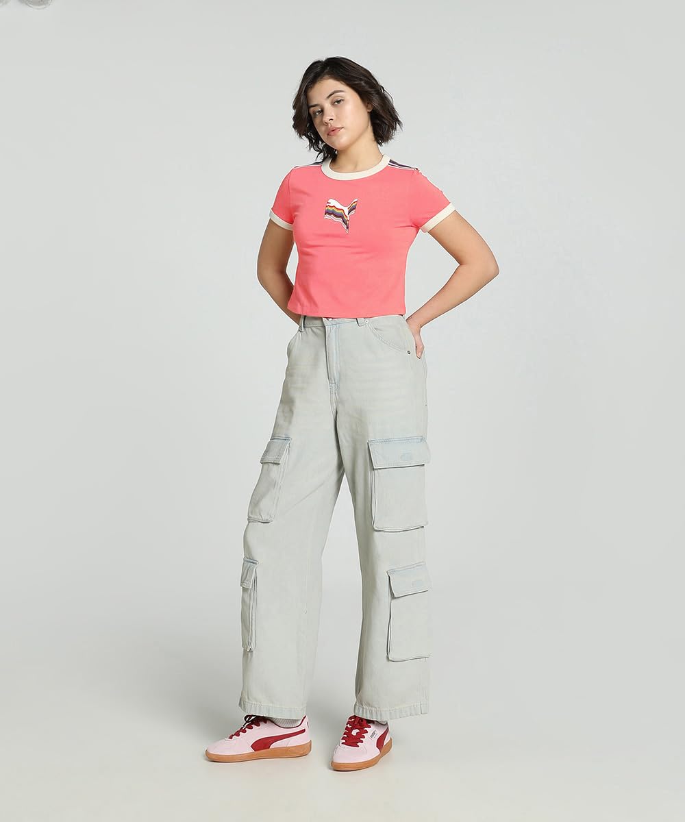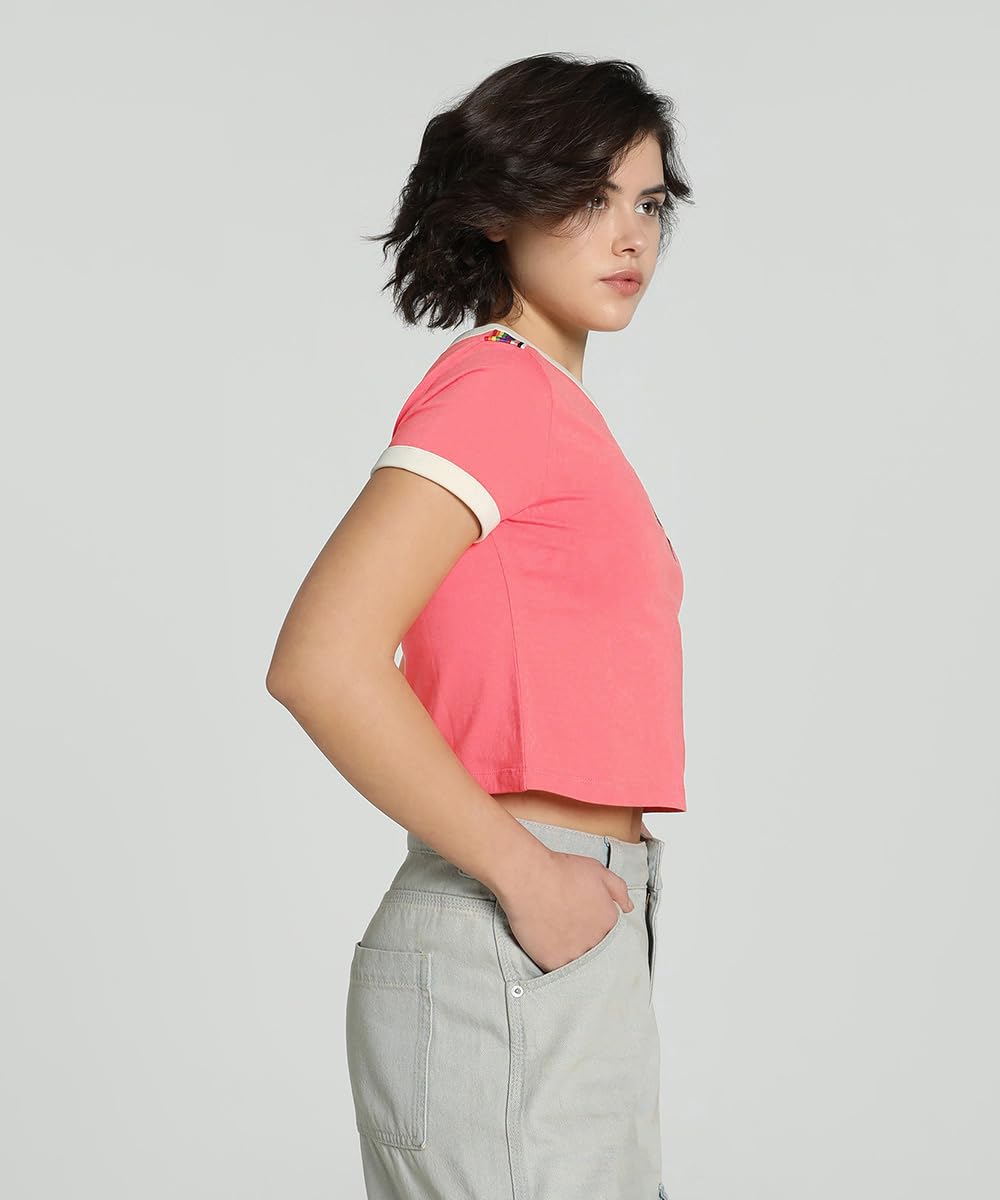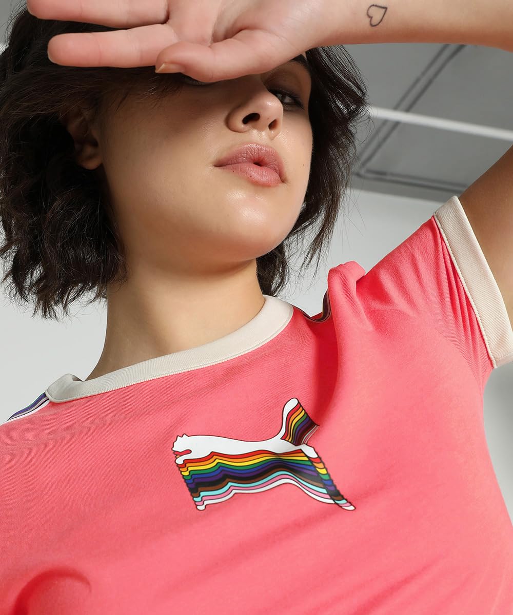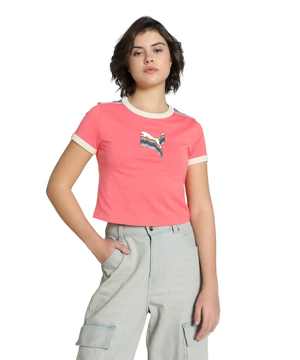 PRODUCT STORY : Embrace everything (and everyone) you love with this PUMA baby tee featuring rainbow knitted tape on the shoulders and a bold chest graphic. The ribbed neckline and cuffs add a sporty touch, making it perfect for expressing your unique style and energy. FEATURES & BENEFITS : Made with at least 20% recycled cotton DETAILS : Slim fitSingle jersey fabricCropped lengthCrew neckShort sleevesPUMA branding details