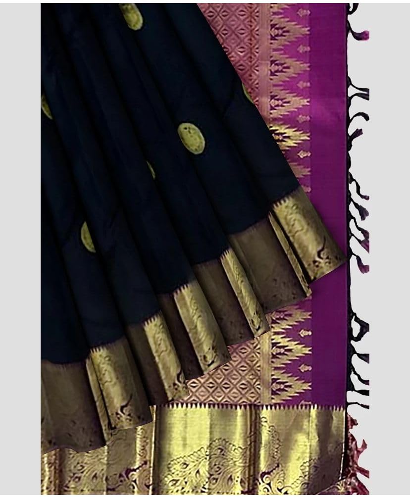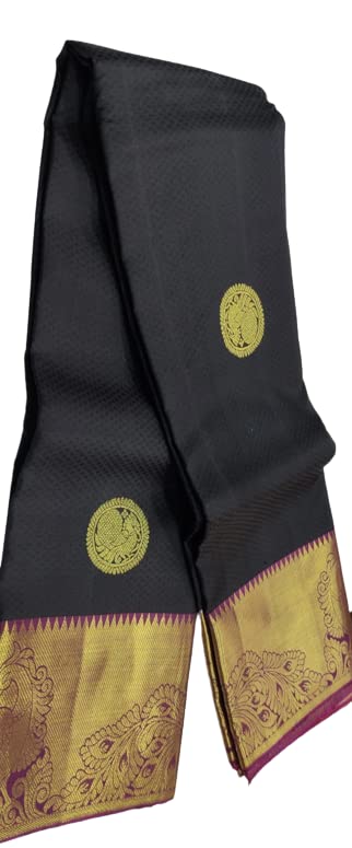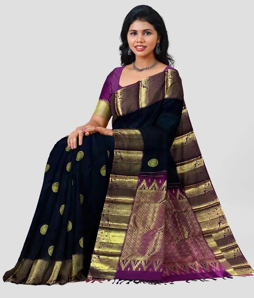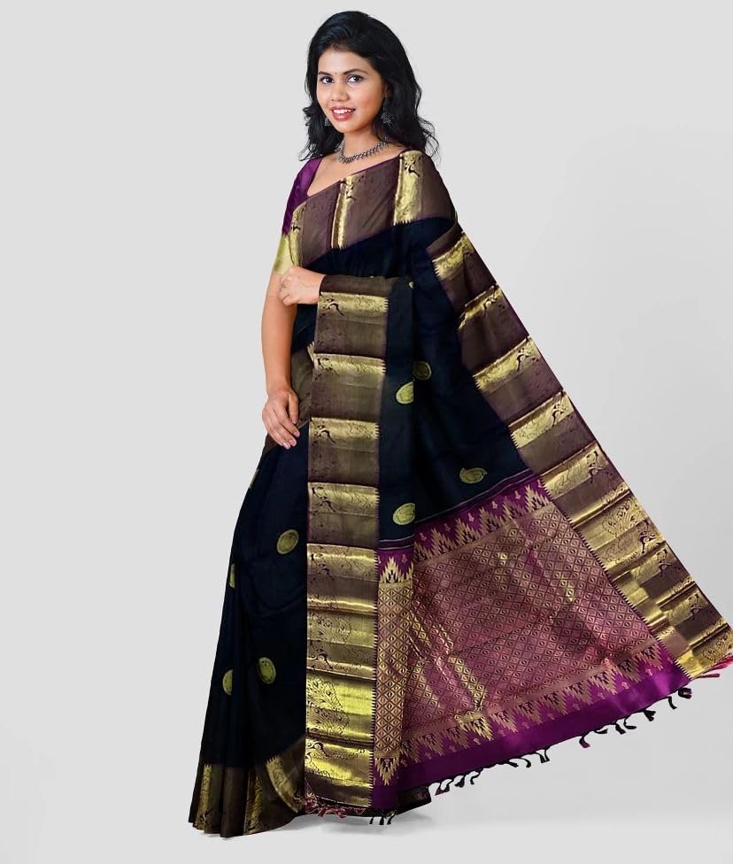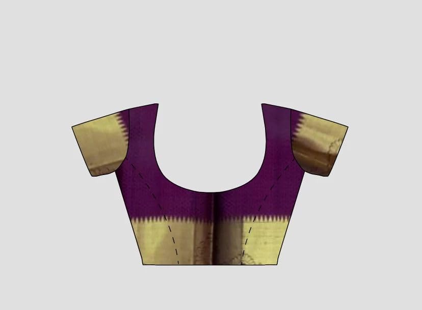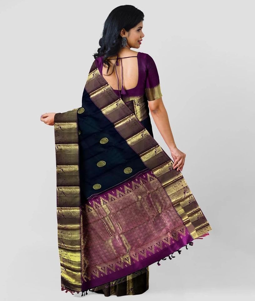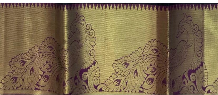 • Elegant Design: This pure silk saree features a striking combination of colours like purple, brown, and gold, with intricate patterns and motifs.