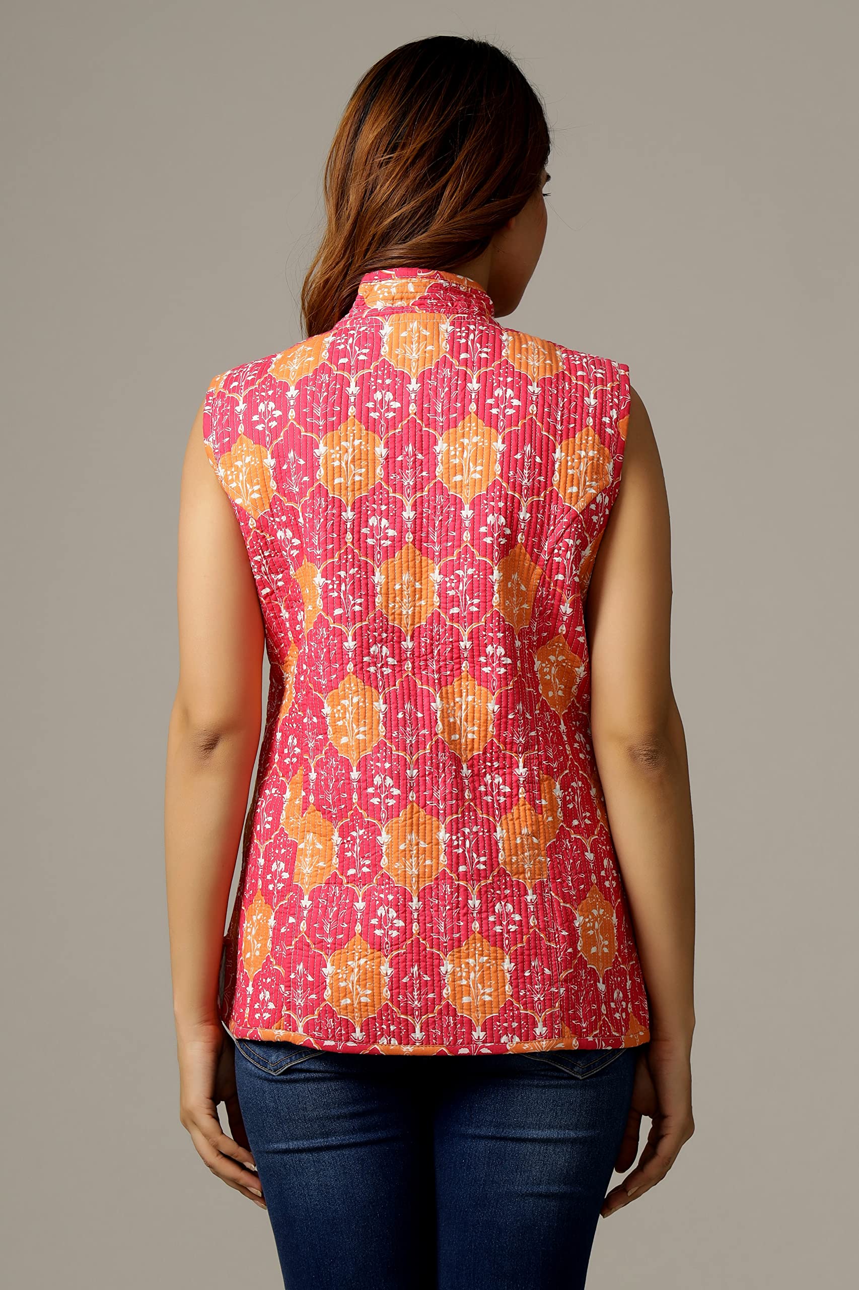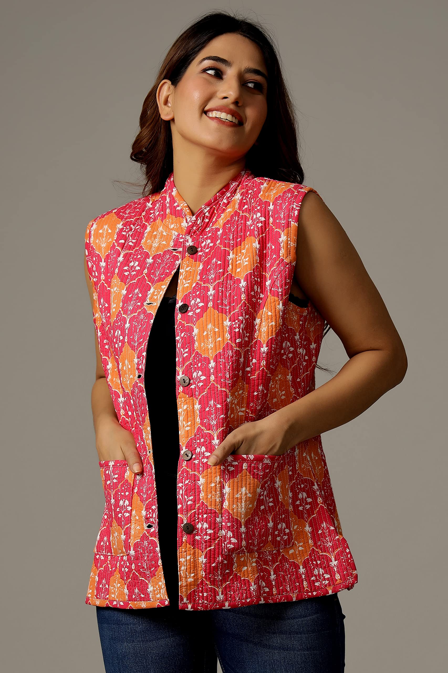 Ravaiyaa - Attitude is everything Women's Floral Printed Reversible Quilted Jacket Coat Blazer Jacket Sleeve Less Waistcoat (Pink Floral, Medium)