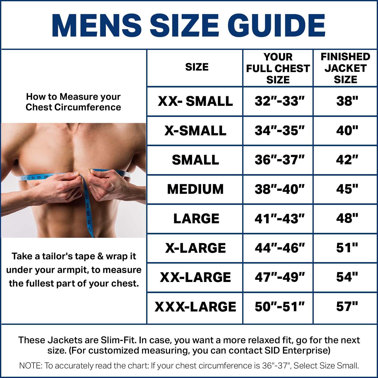 Leather products have always been used by humans for many millennia as a tool of luxury, comfort, fashion, and warmth. Real Leather Ages beautifully with time. It takes on the character of the wearer. Natural leather is breathable so you wont feel sticky and suffocated as you do with PVC synthetic imitation. SID owns the credit of always providing the genuine leather with perfect stitch,comfort and fashion. You dont buy a quality product you buy quality lifestye.Why not treat yourself or someone special with this luxurious leather product. When selecting a size, please leave at least 3-4 inches from body measurement to get a slim fit. For example, if the chest circumference is 38 inches, please select a jacket whith chest of 42 inches to get slim fit. e.g ( 38 + 4 ) = 42 inches. Can’t find the right size? No need to worry,just send in your shirt or jacket measurements and we will stitch it for you.