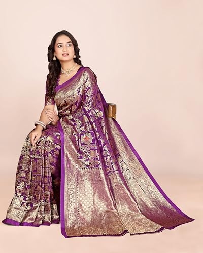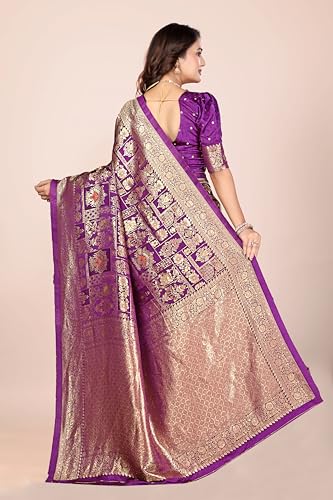 - FABRIC COMPOSITION: Luxurious Banarasi silk saree featuring intricate zari work in a stunning purple and gold colour combination