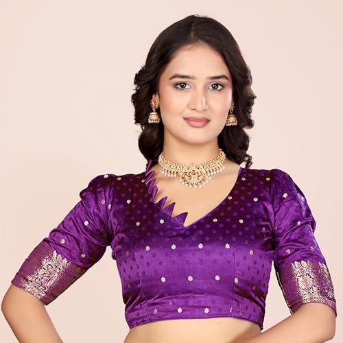 - BLOUSE FEATURE: Comes with a matching purple blouse piece with elegant zari detailing and comfortable elbow-length sleeves