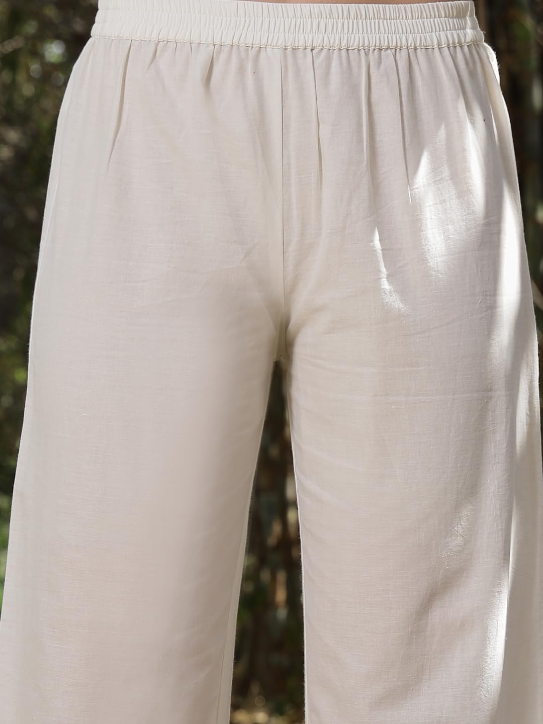 - White summer special pure cotton a-line co-ord set. Co-ord set has bell sleeves, kantha work, scalloped V-neckline. Paired with cotton printed palazzo