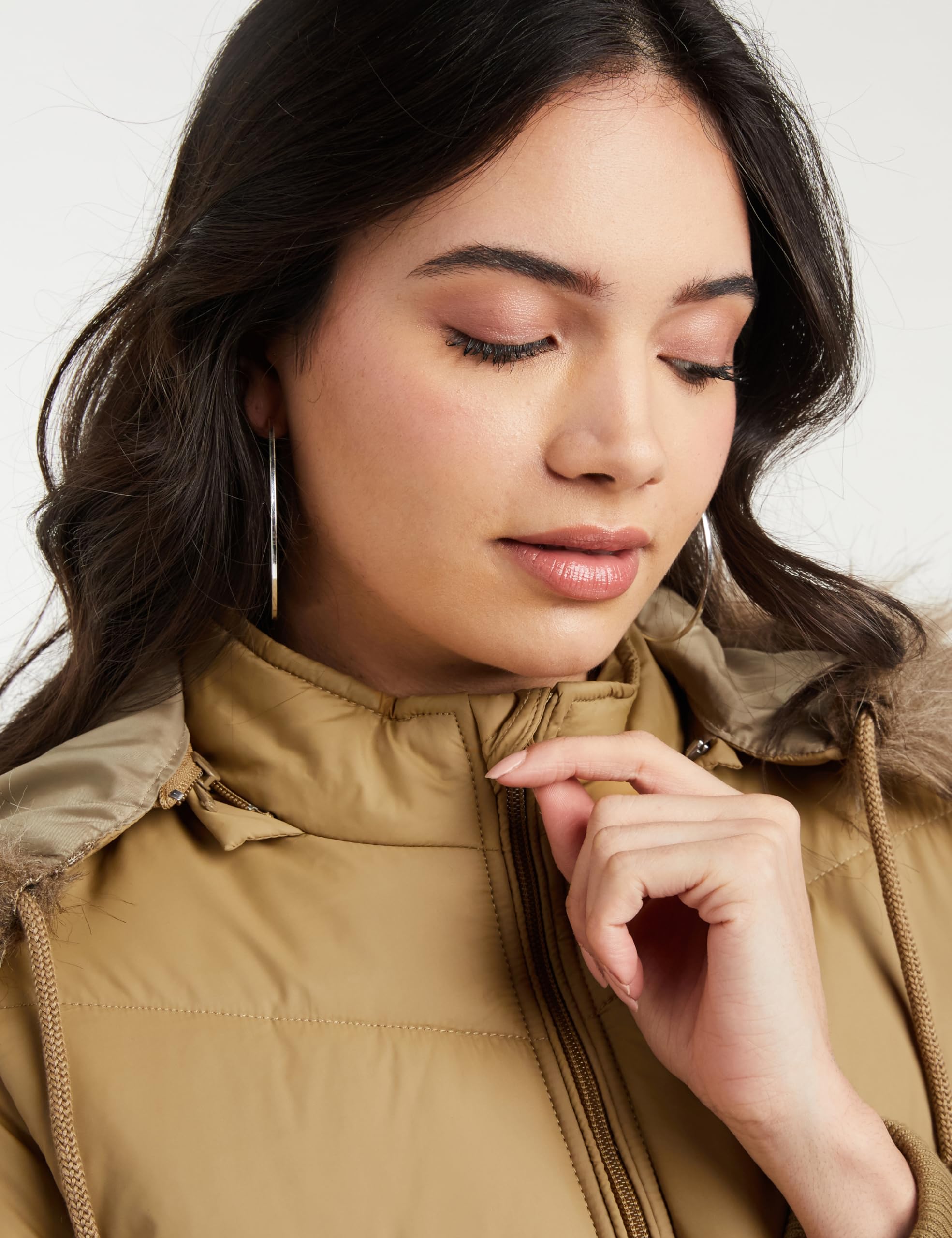 - This jacket features a collar with faux fur detail, front zipper closure and functional pockets