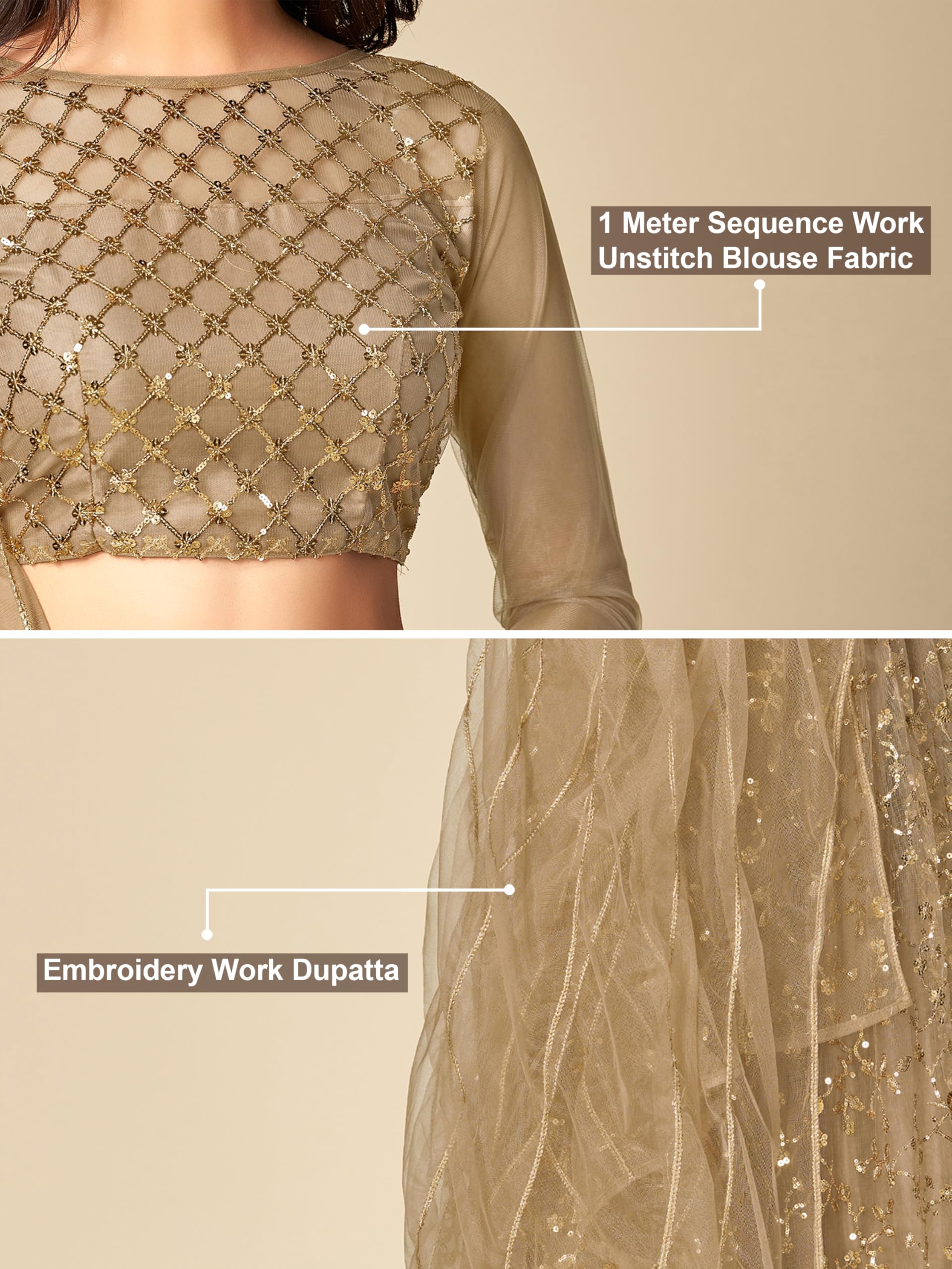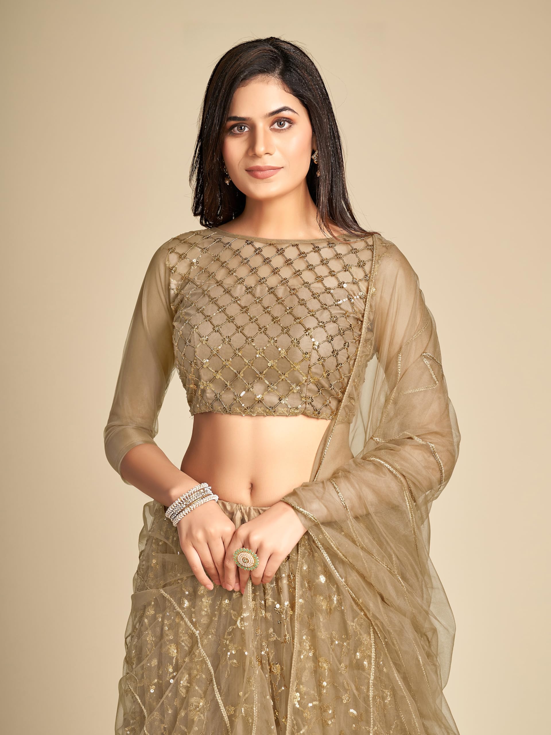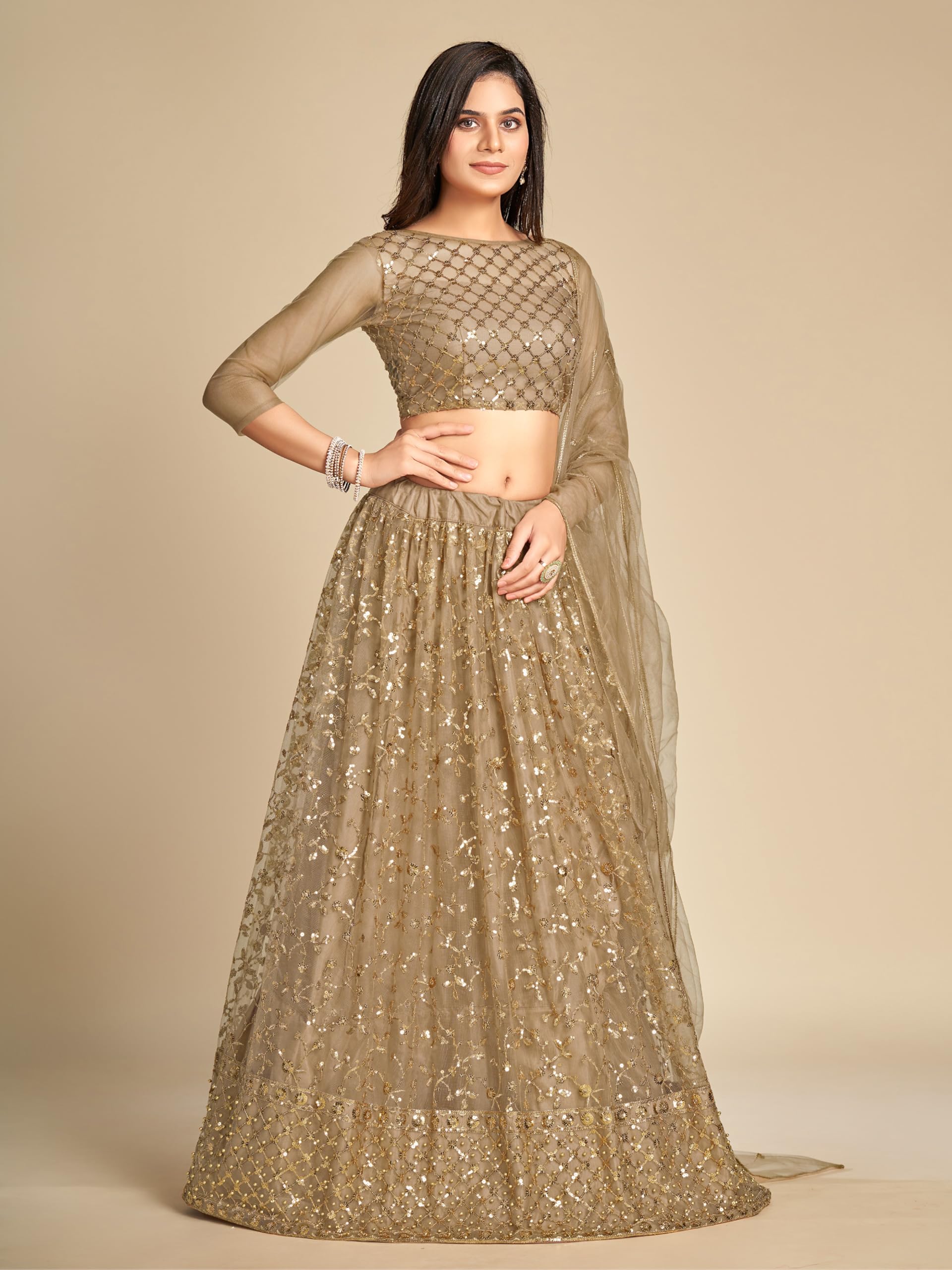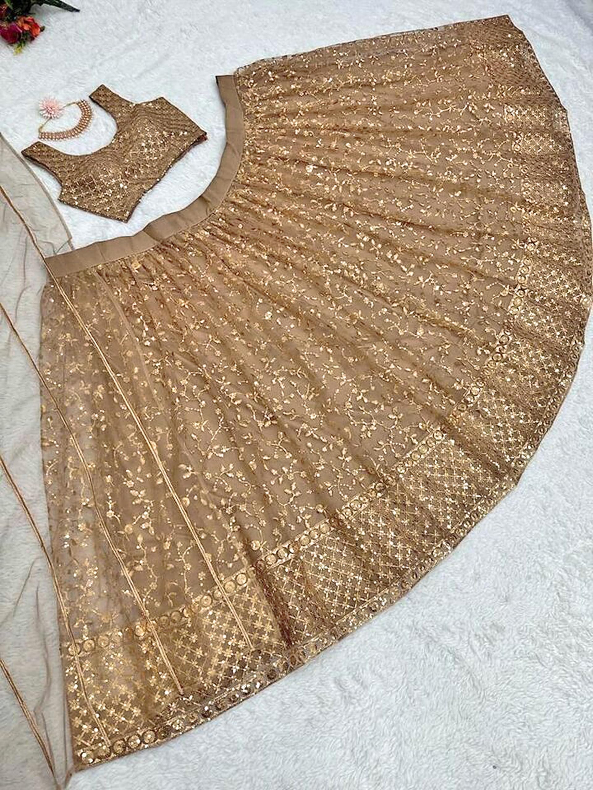 TRENDMALLS Women’s Net Embroidery Lehenga Choli With Net Dupatta (L144-Gold, Semi stitched)