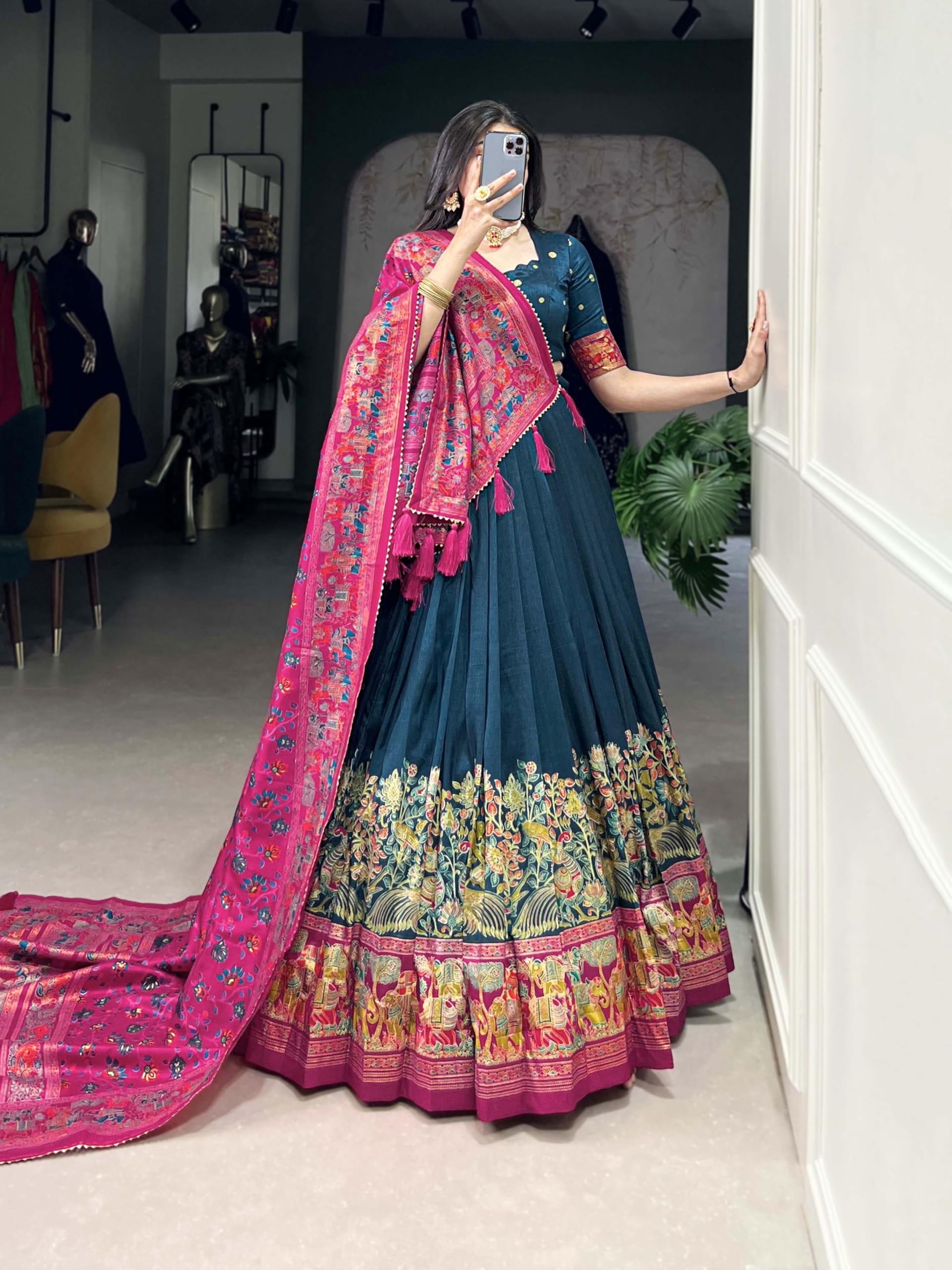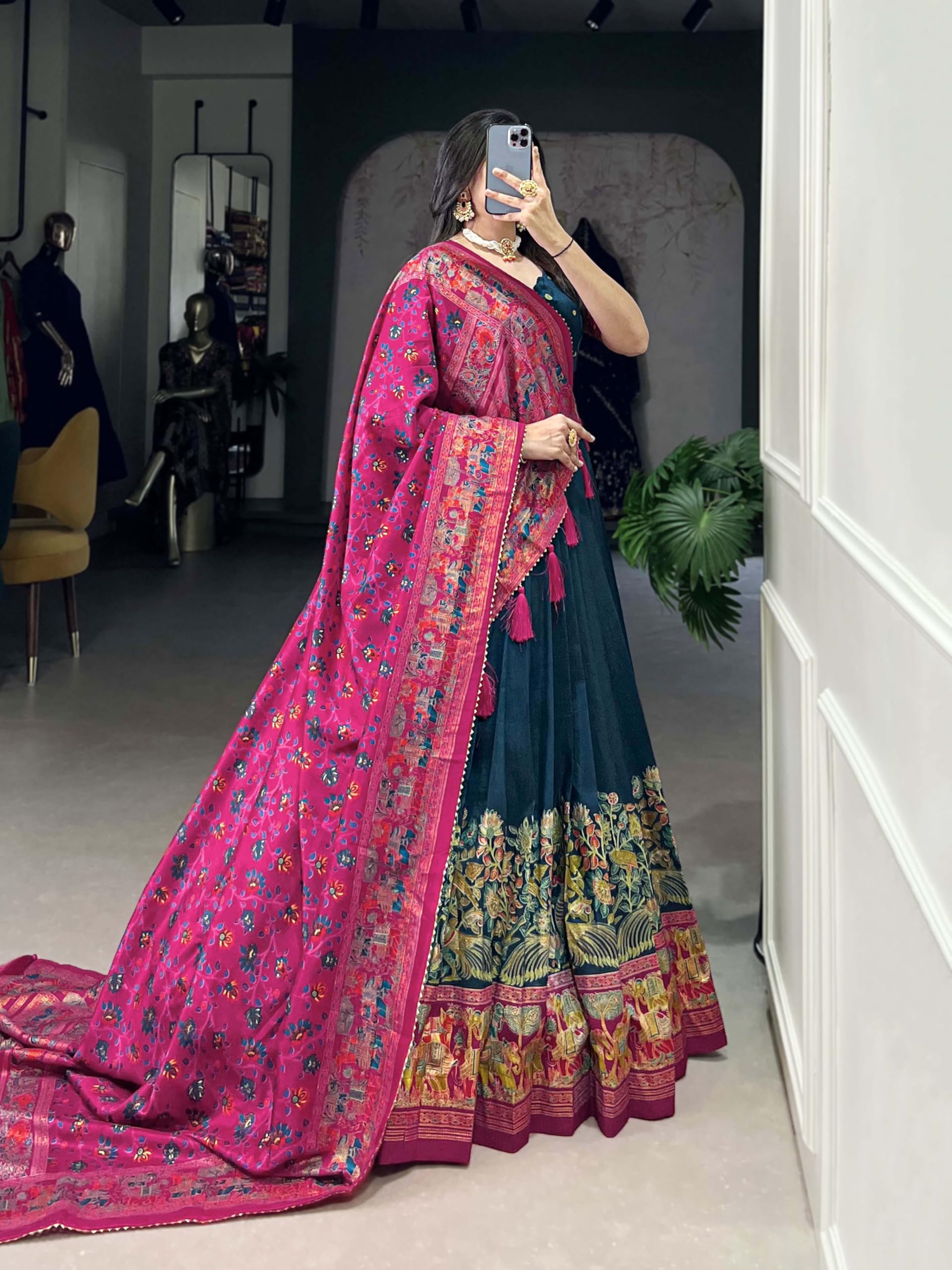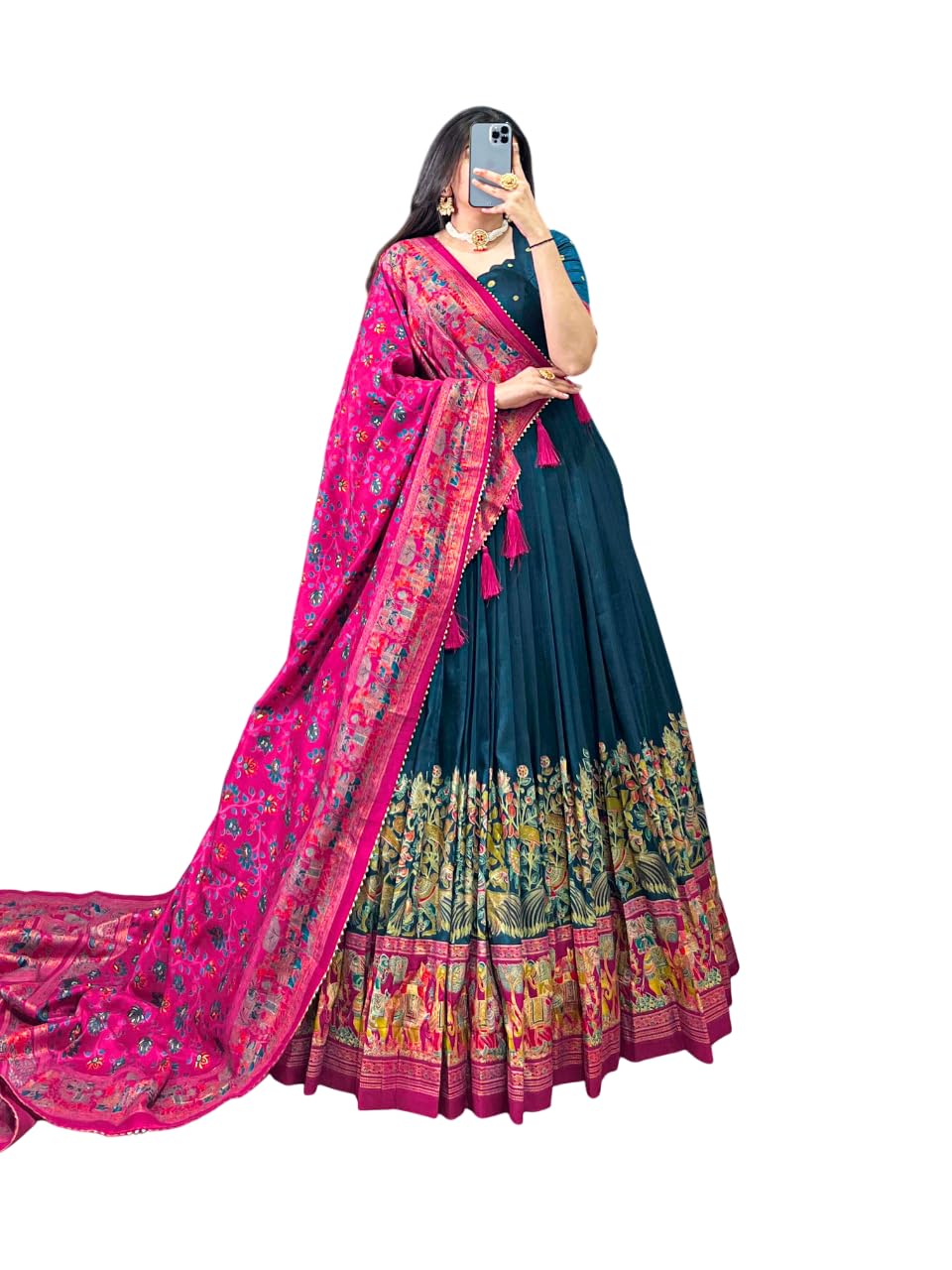 Women’s Trending Designeer Tussar Silk Lehenga Choli Print with Foil Work With Unstitched Blouse Patola Print Adorned with Foil Work For Navrati || Wedding (MORANI NAVY BLUE)