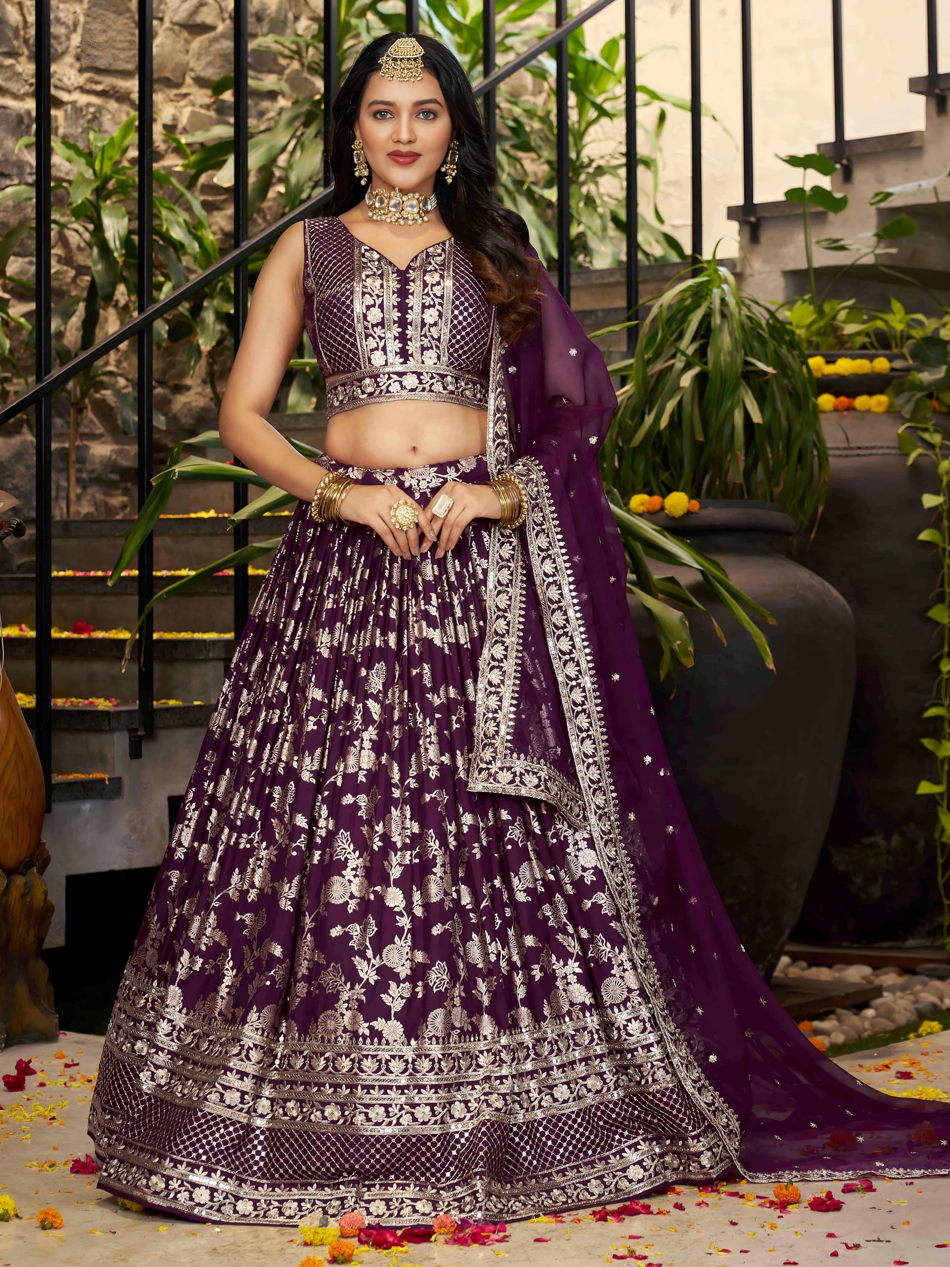 Zeel Clothing Women’s Sequins Zari Embroidered Dola Silk Jacquard Lehenga Choli With Dupatta (7100-Women-Lehenga-Choli-Latest, Free size) (Wine)