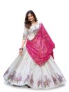 - Measurements: Lehenga(Semi-Stitched) Flair : 3.50mtr, waist-43″, height-43″; Blouse(Unstitched) Size: up to 44″; Dupatta Length: 2.25 mtr