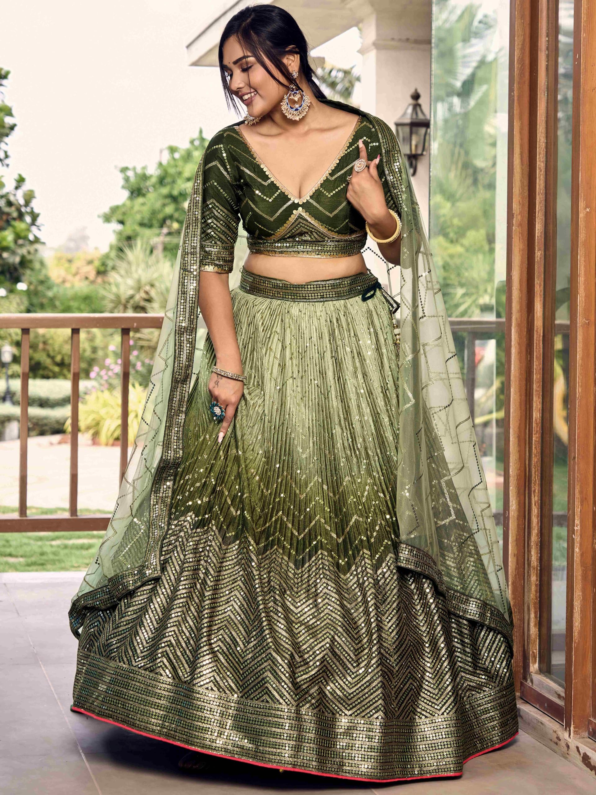 - Lehenga Work: Zari and Sequins Embroidery on Shaded fabric; Blouse Work: Zari and Sequins Embroidery; Dupatta Work: Zari and Sequins Embroidery Work